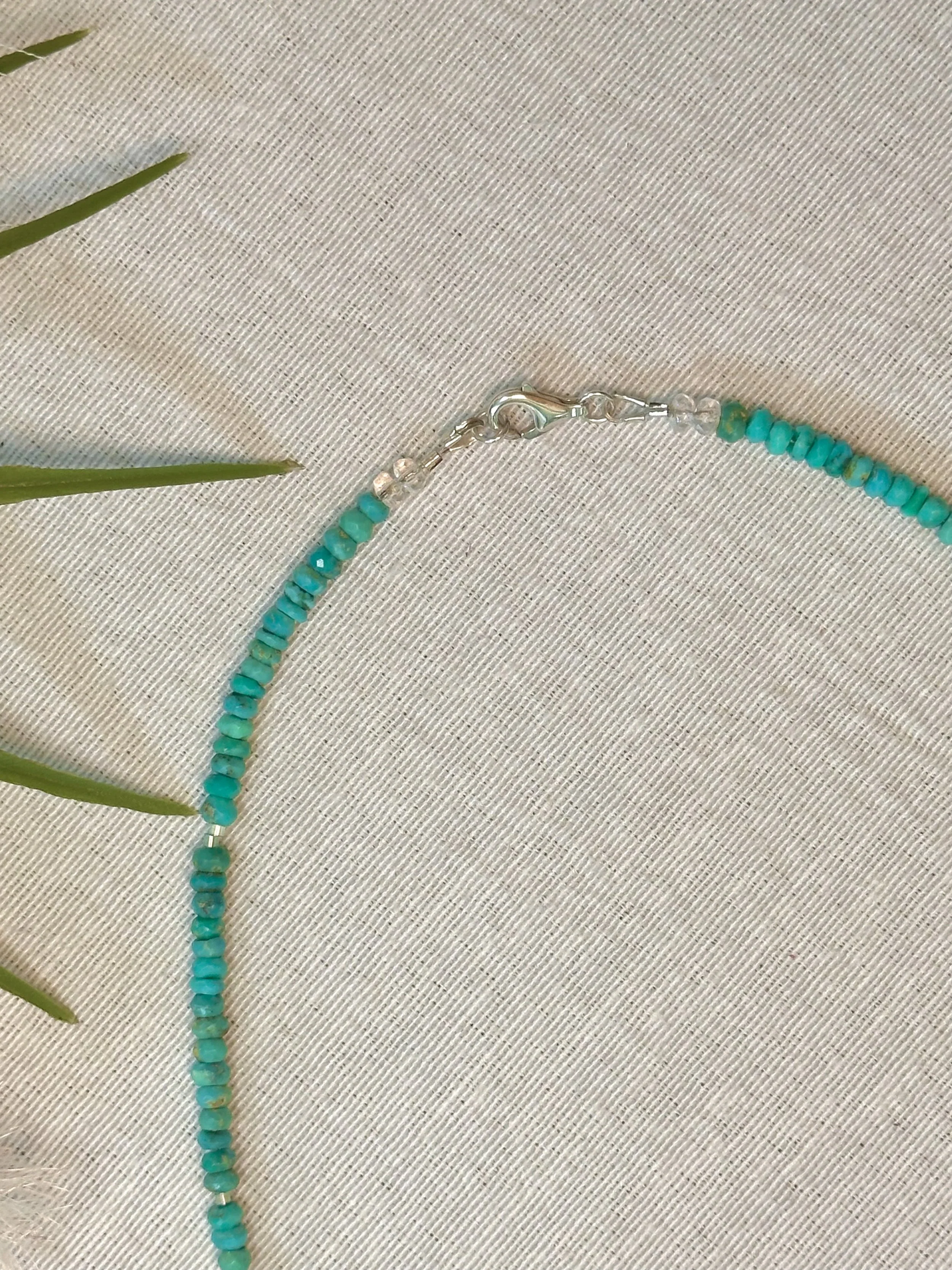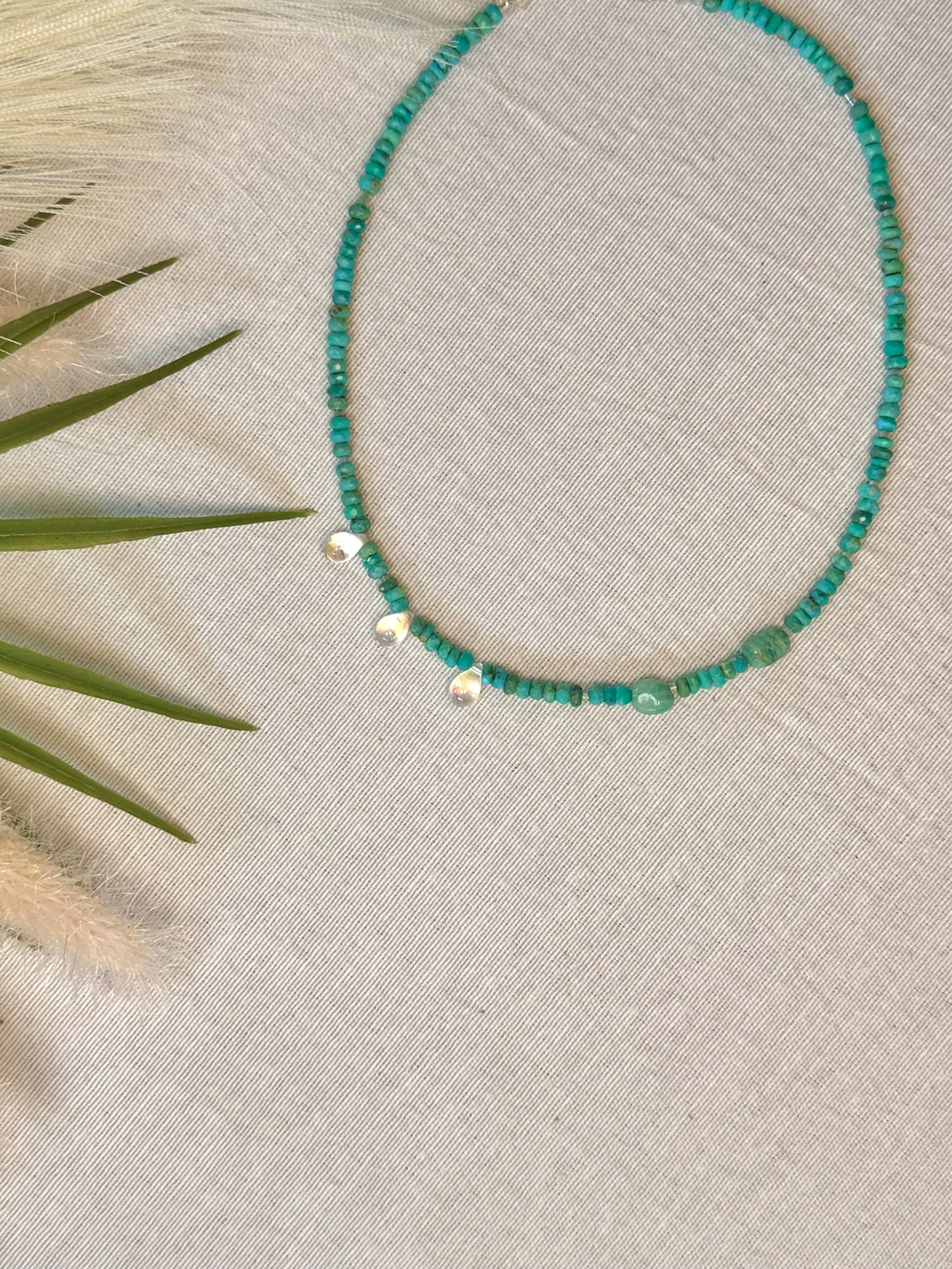 A serene blend of earth and sea, this necklace pairs the rare vivid blue-greens of Carico Lake turquoise with the soft shimmer of iridescent freshwater pearls and the calming hues of natural amazonite. Accented with delicate opal glass droplets, it captures the gentle sparkle of sunlight dancing on water.