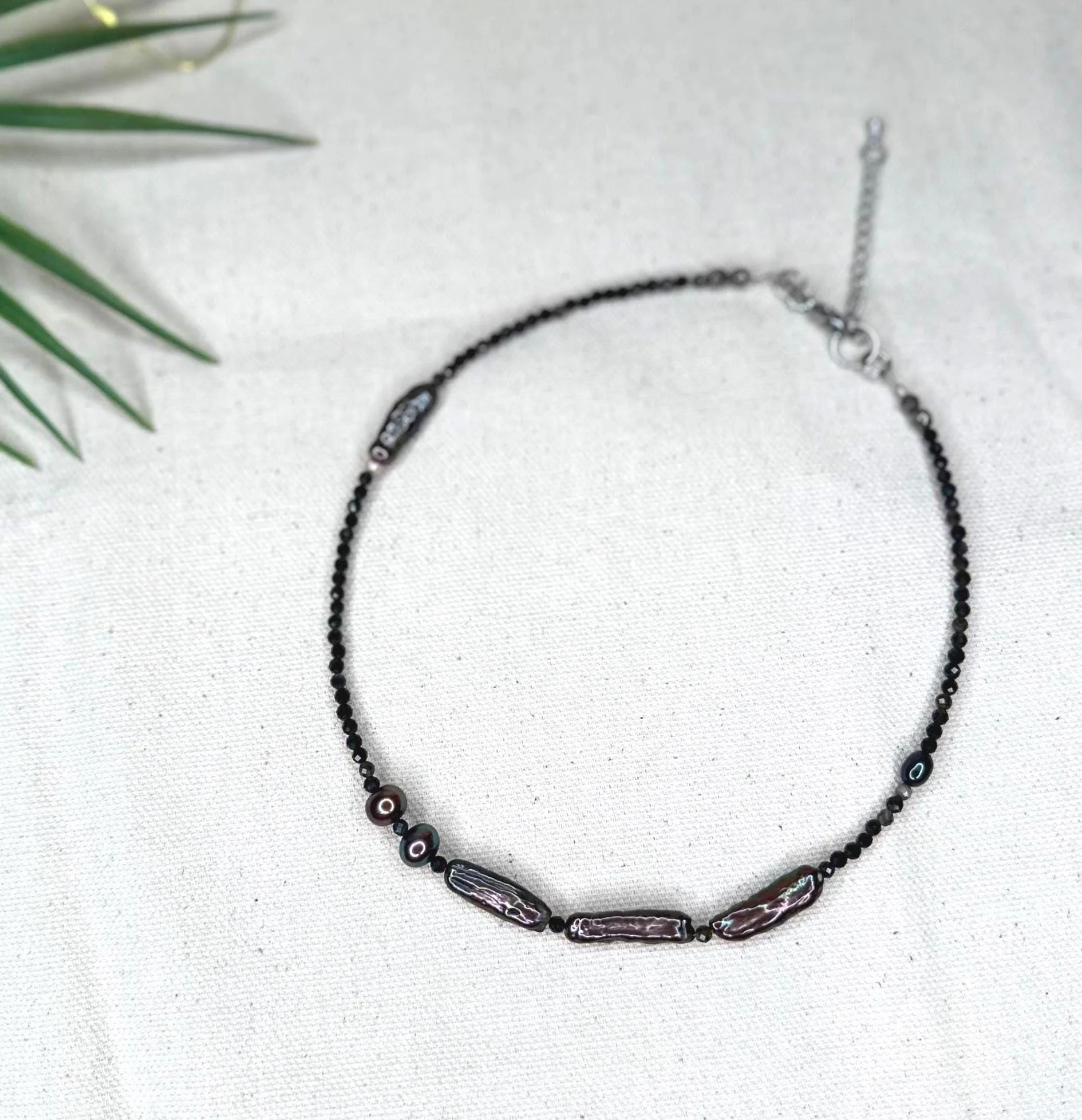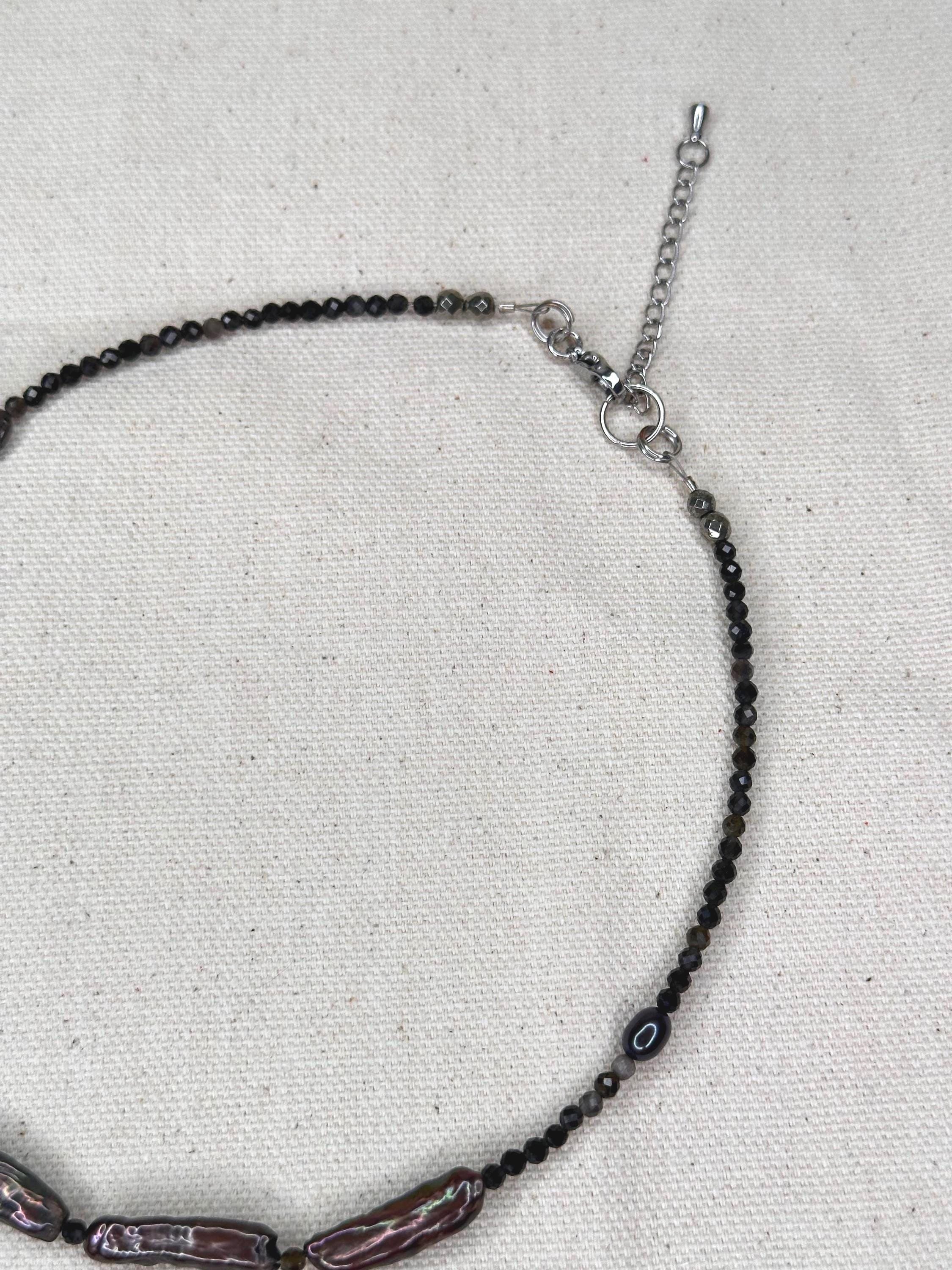 Rainbow onyx joined by three Tahitian pearls sourced from Maui, Hawai'i and four black freshwater biwa pearls. The perfect trio of iridescent black to catch the light and throw shadows of purple, green, blue, and some gold in the onyx!
