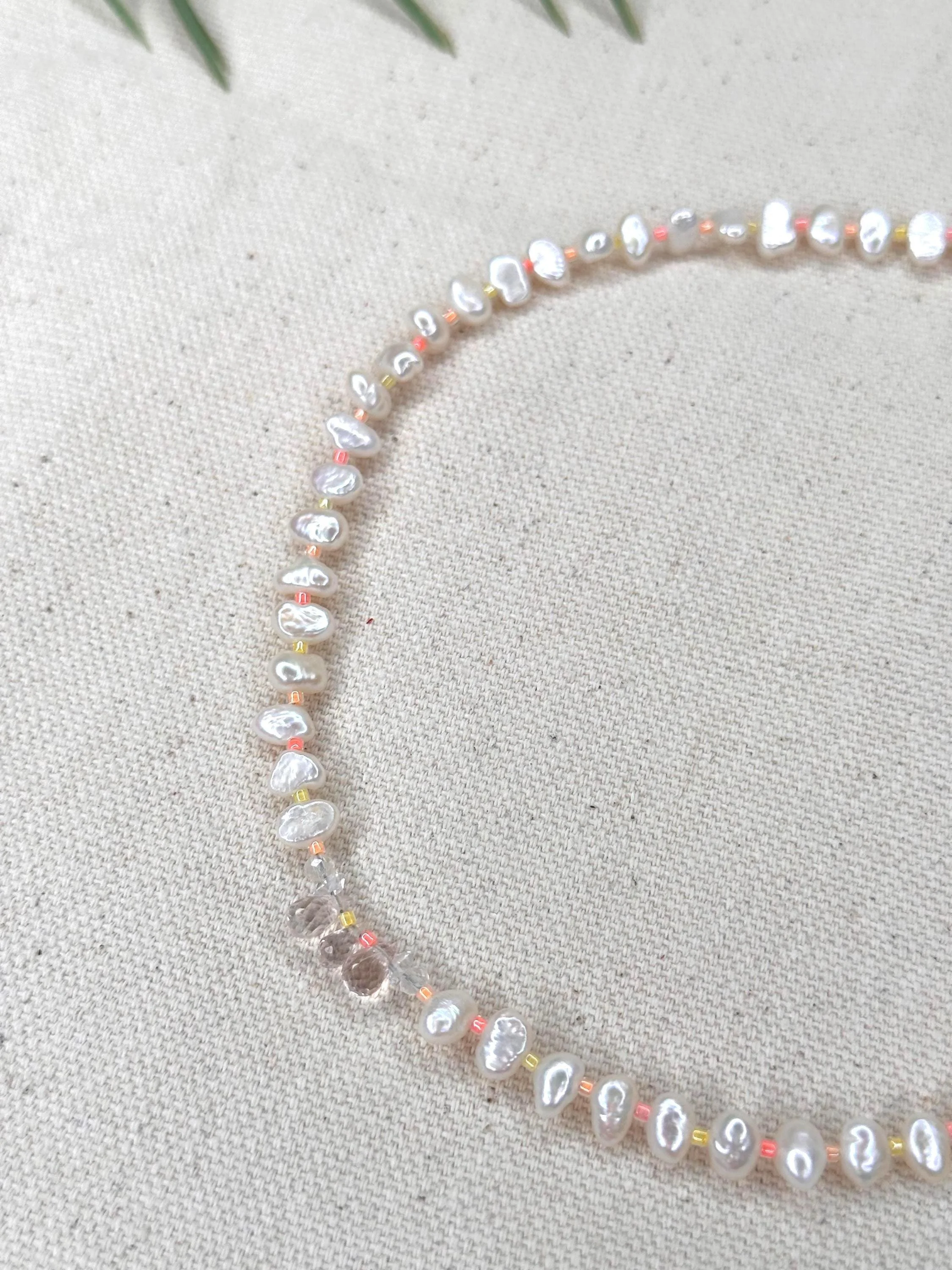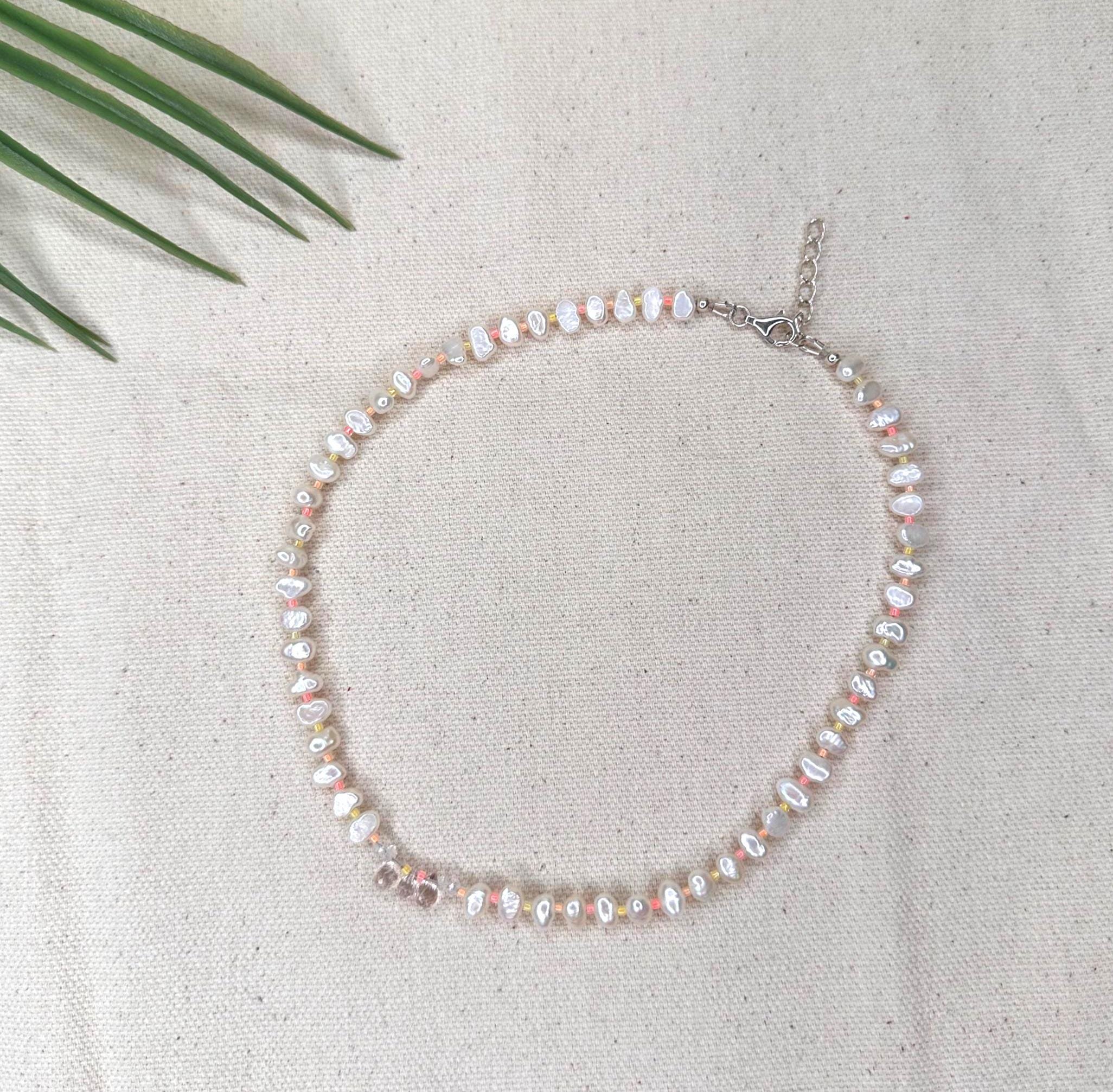 A radiant 15" choker that glows like sunrise breaking over calm water. Iridescent white pearls shimmer with soft lunar light, while neon orange and yellow Japanese Miyuki beads pulse with sun-kissed energy. Three micro-faceted teardrop sapphires add a touch of celestial depth—tiny drops of sky anchoring the brightness. Together, the colors feel electric, ethereal, and full of movement, like morning light dancing across waves. Finished with sterling silver hardware and a 1" extender for a perfectly tailored fit.