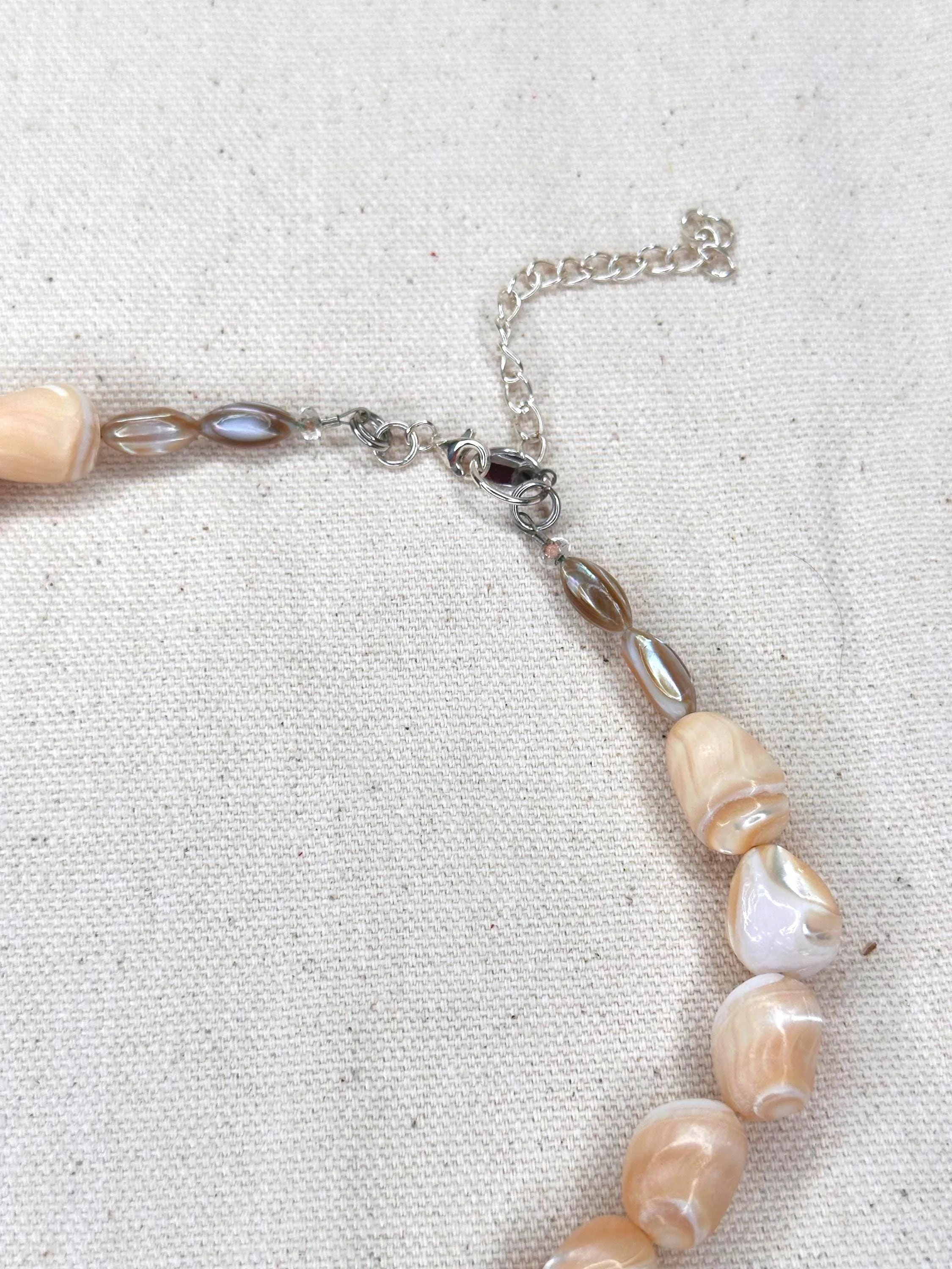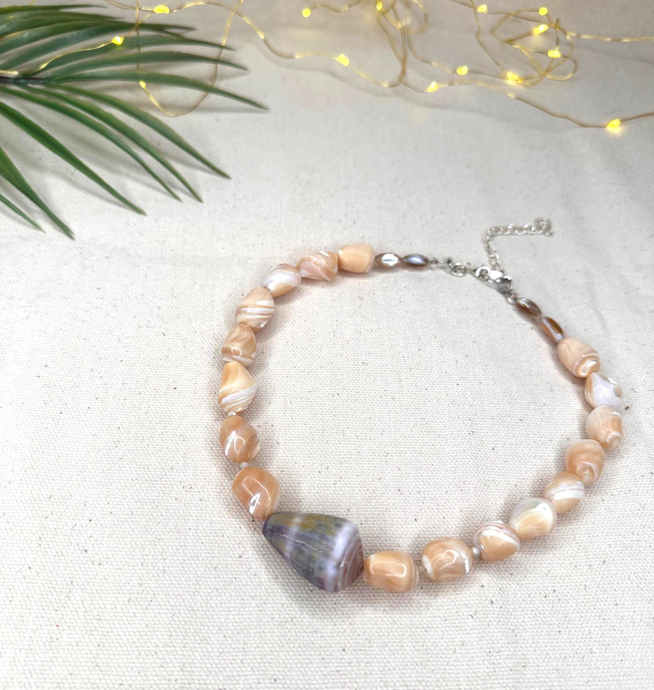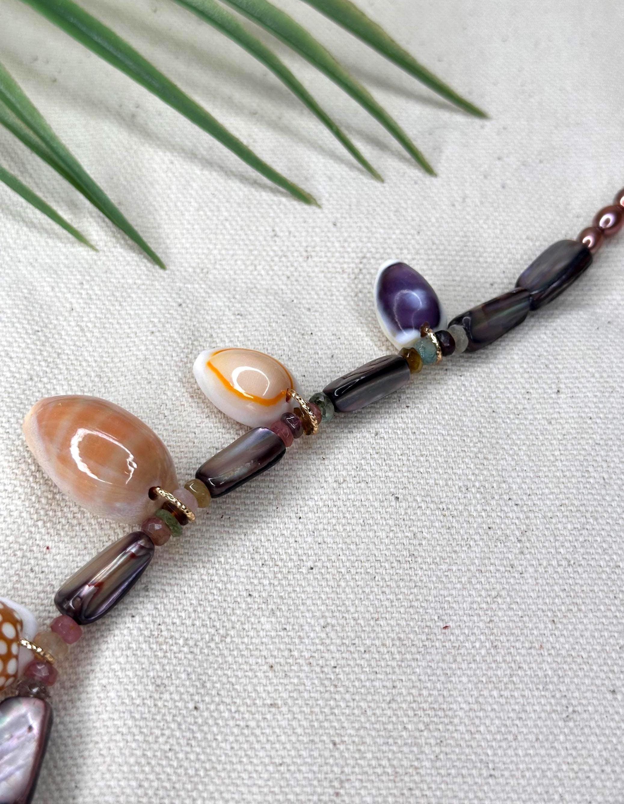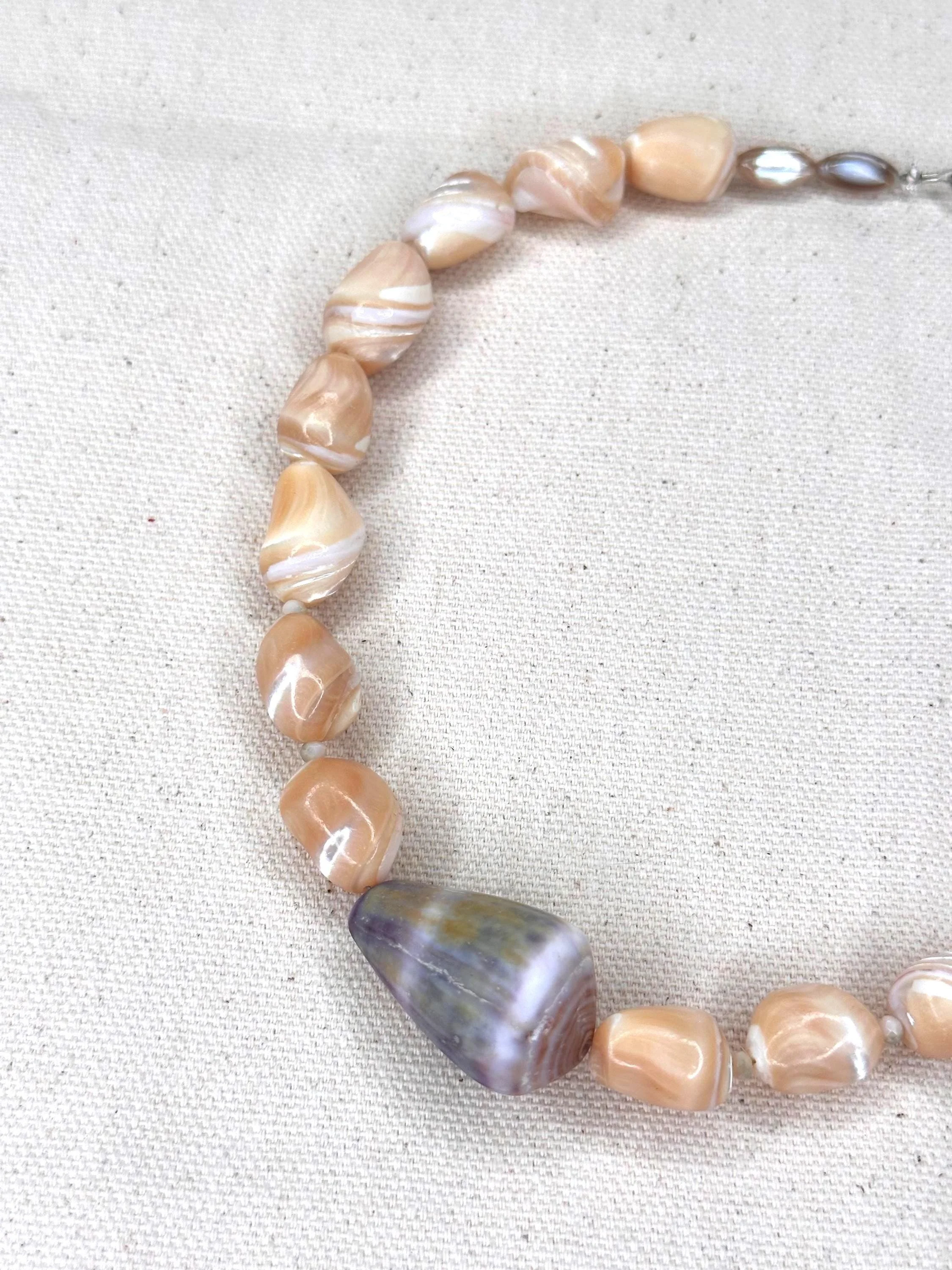 Stones & Shells: Peacock biwa pearls, black tourmaline, abalone beads