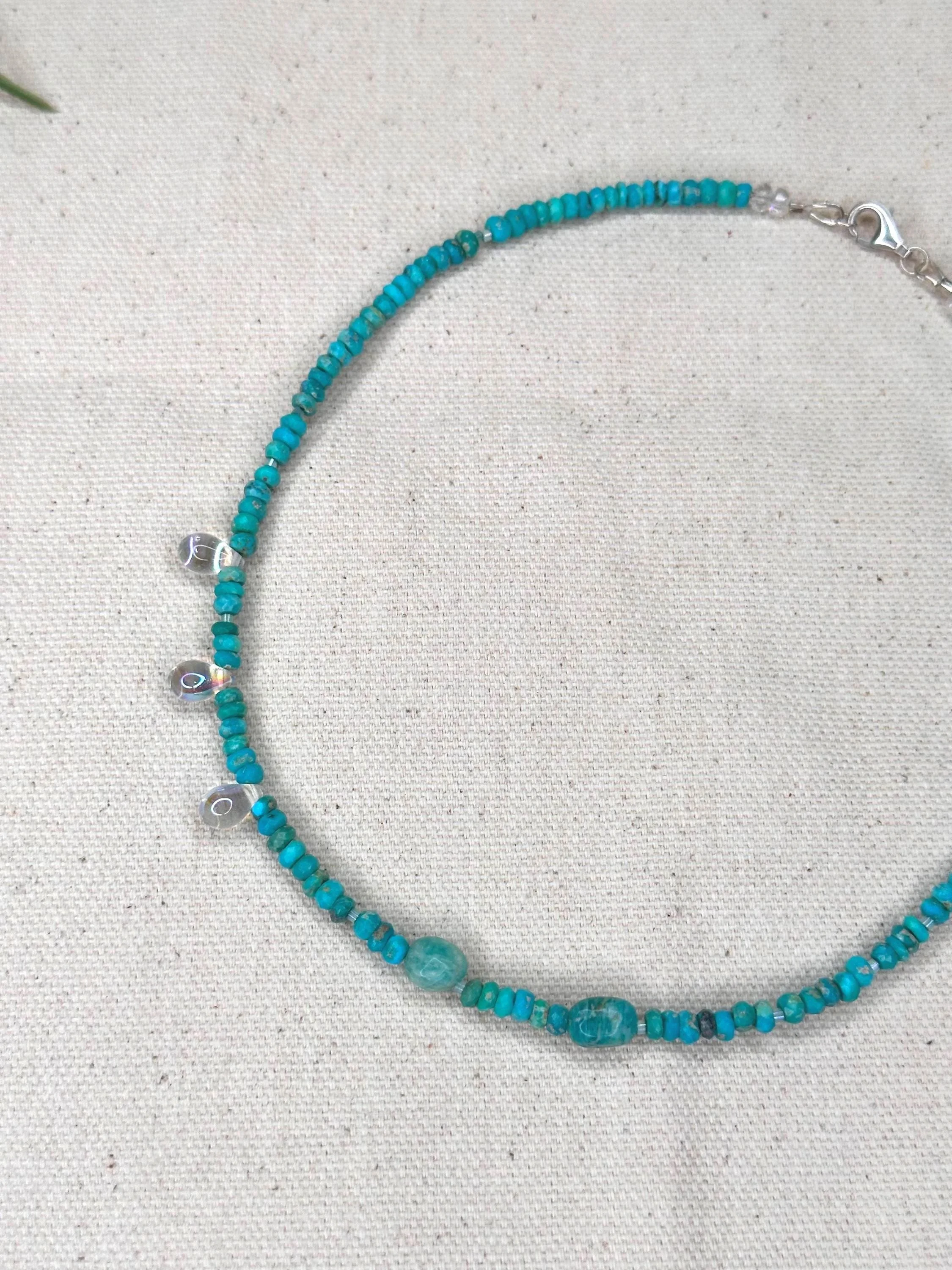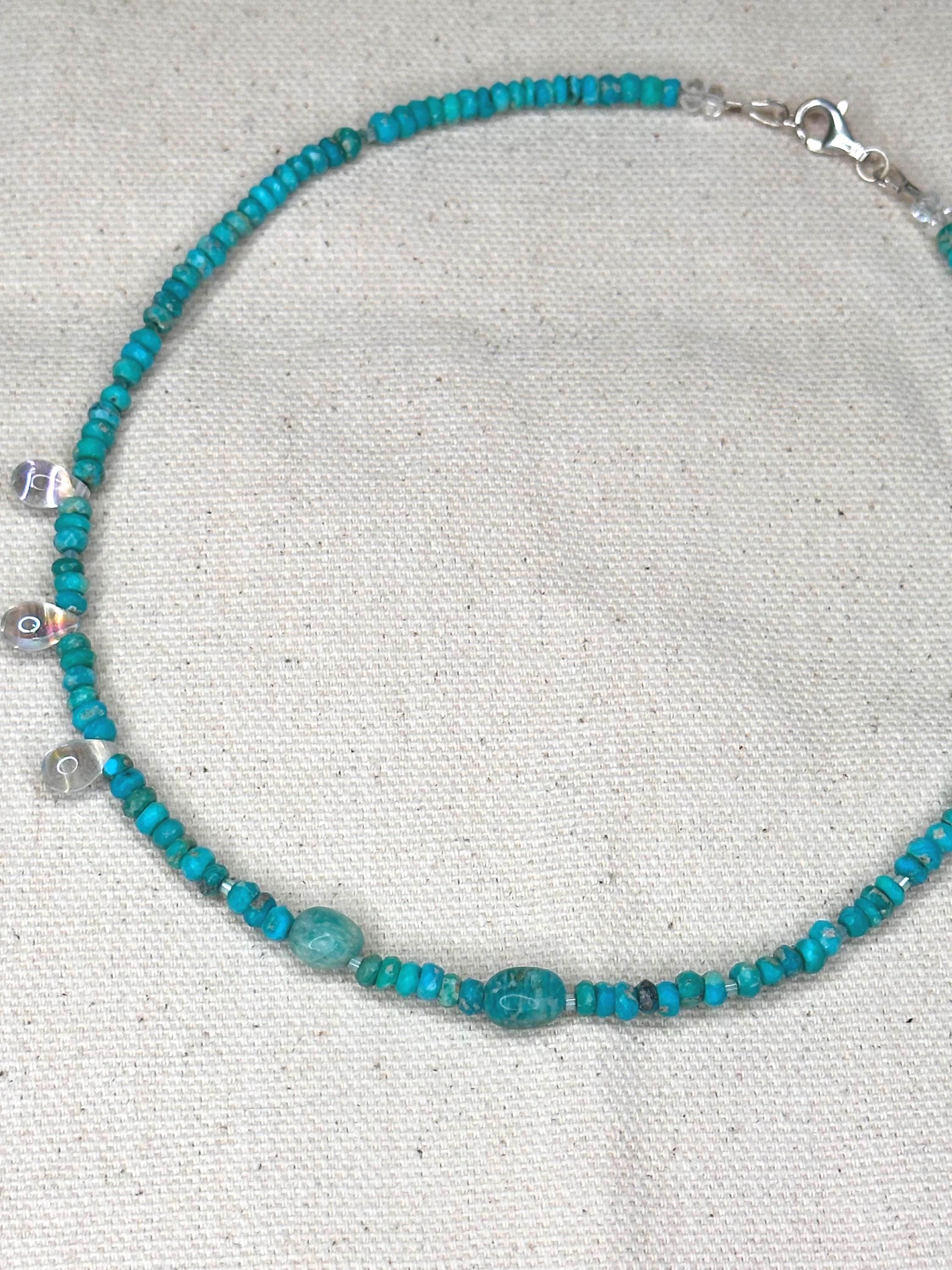A 15" strand of peacock biwa pearls shimmers with deep iridescent hues, shifting like moonlight over dark waters. Black tourmaline anchors the piece with protective, grounding energy, while abalone beads add flashes of ocean fire—blue, green, and violet glints that feel almost otherworldly. Finished with sterling silver hardware and a 1.5" extender, this necklace carries the magic of the deep sea: mysterious, powerful, and luminously alive.