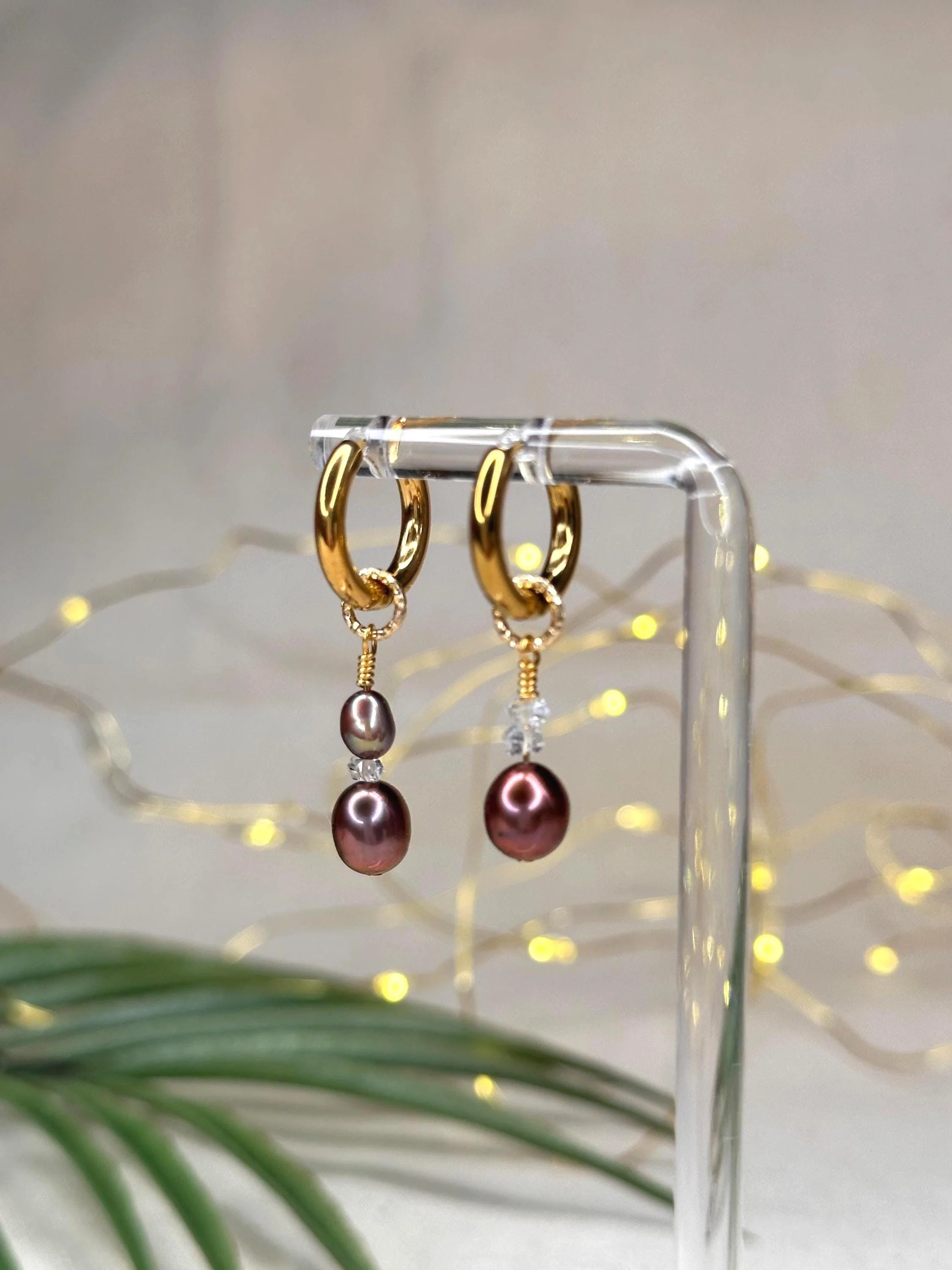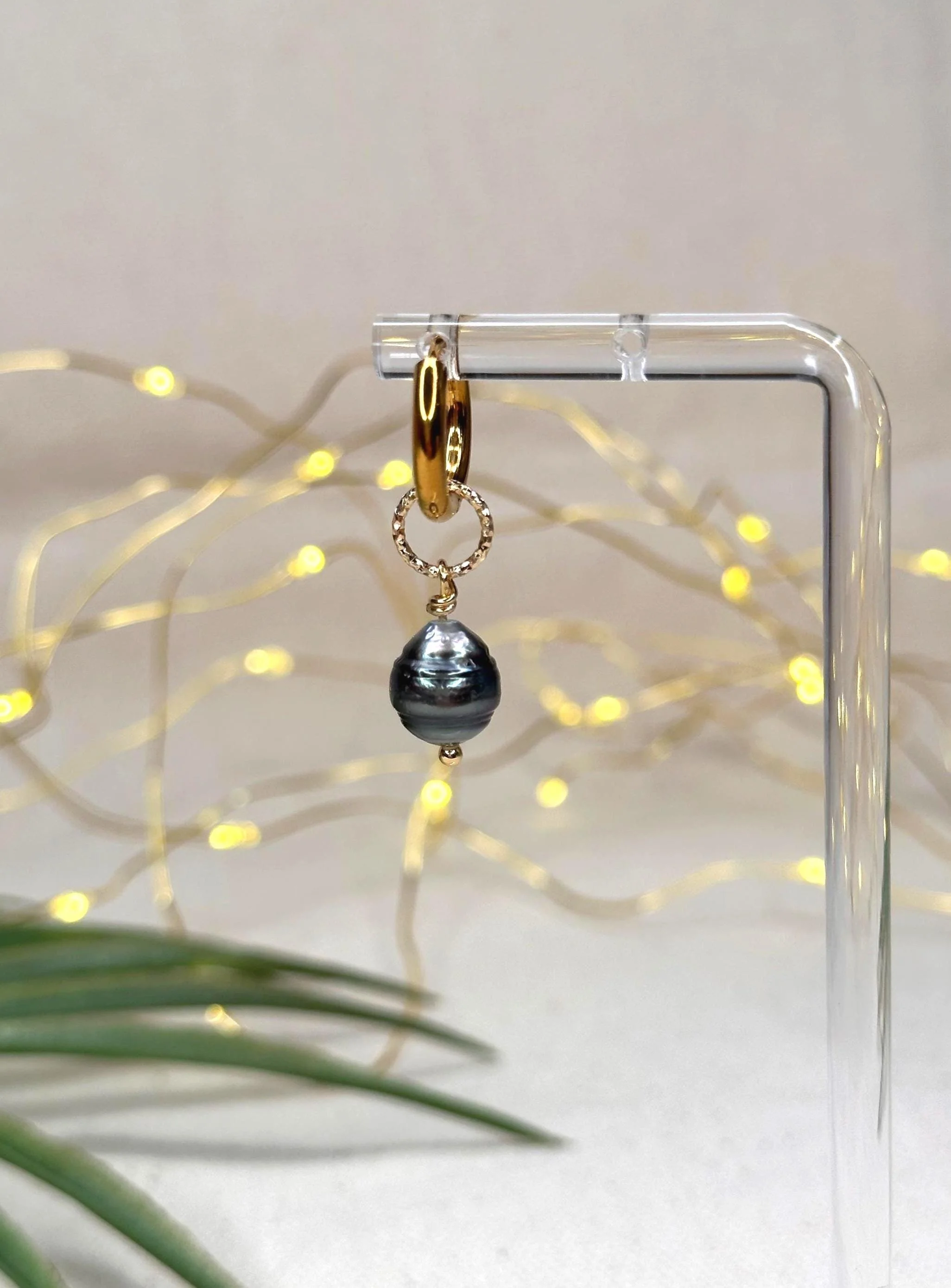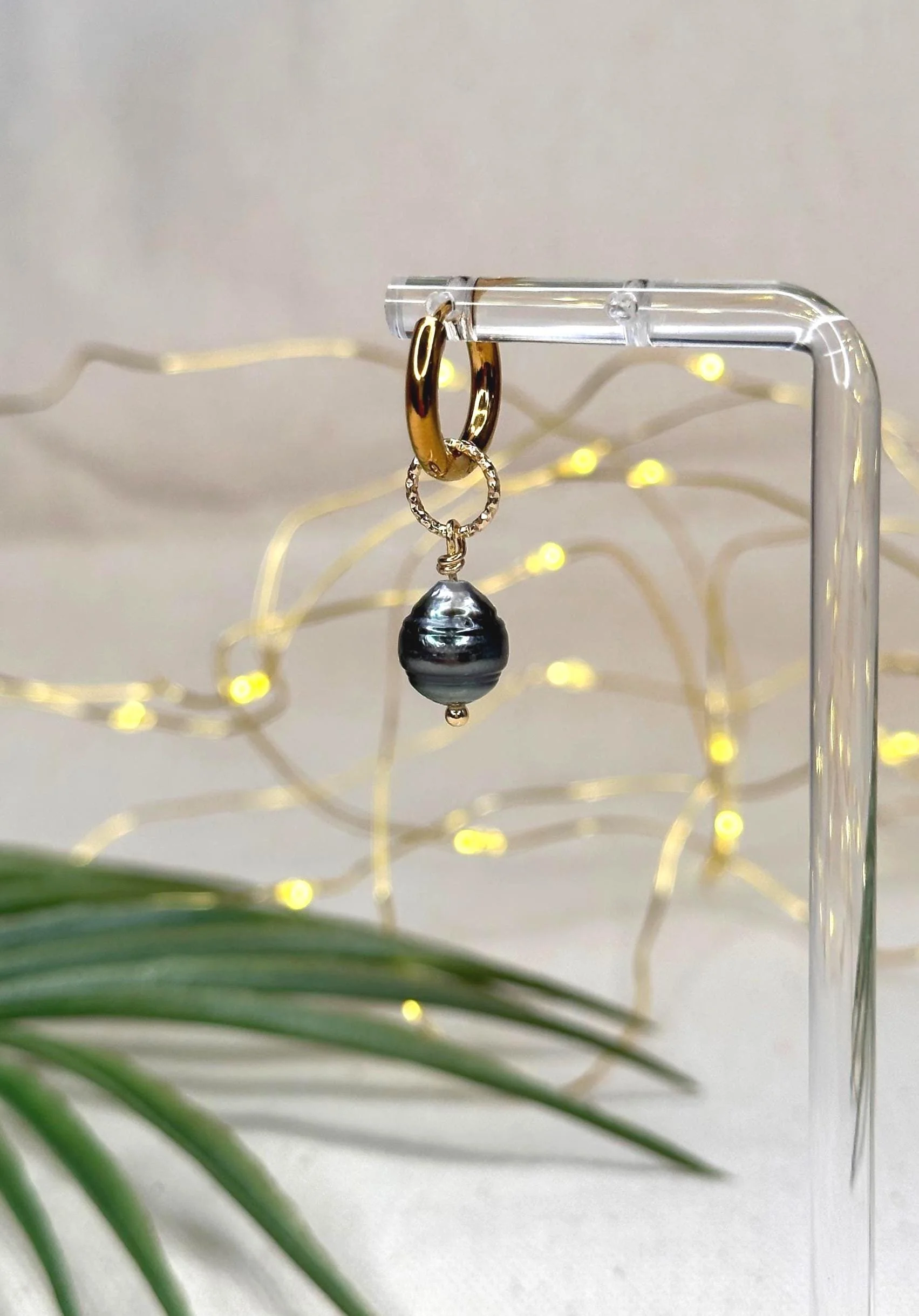 Dark Tahitian pearls sway from glowing gold hoops, paired with CZ charms—an alchemy of light and depth made to feel like an ocean-born spell you wear.