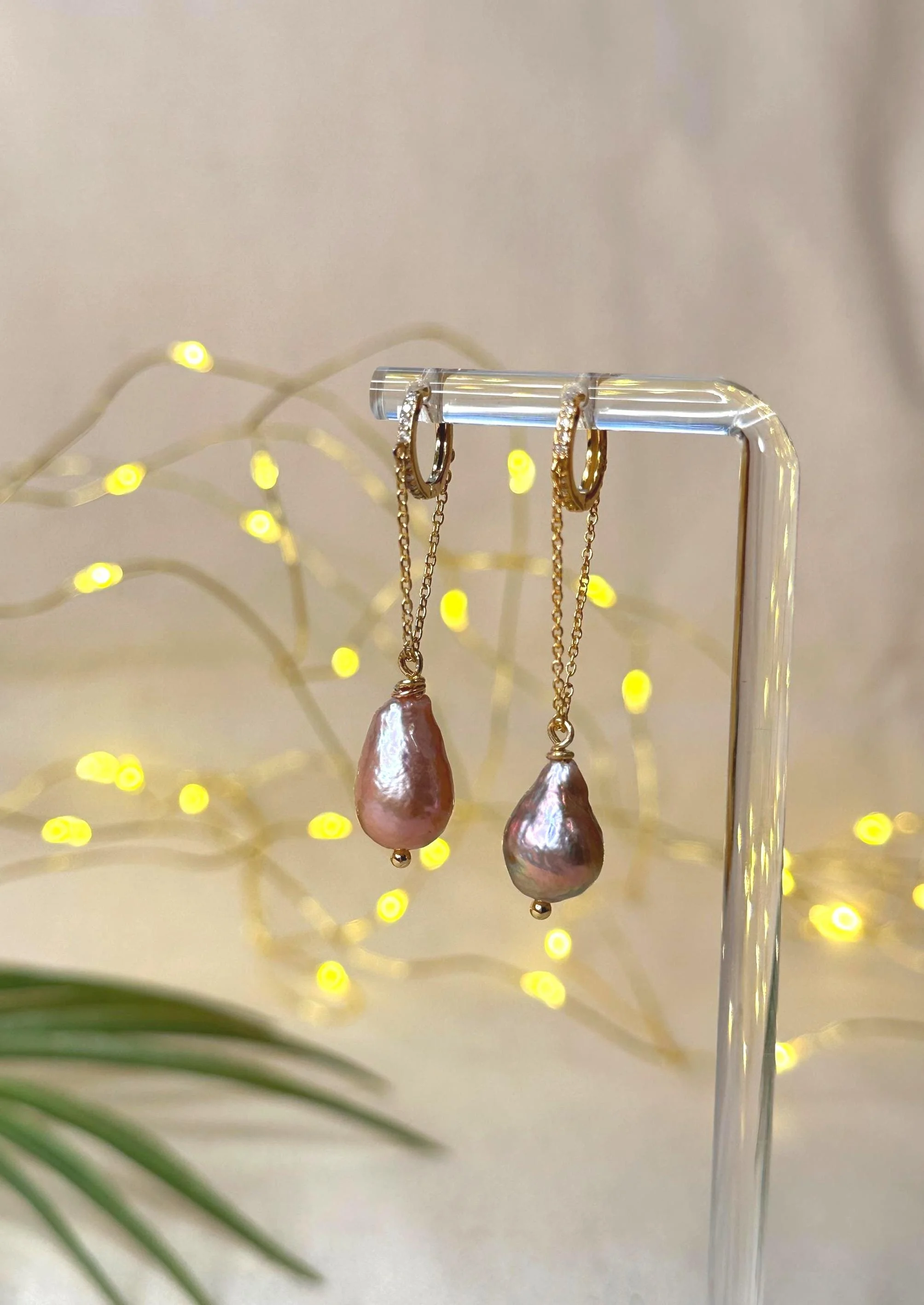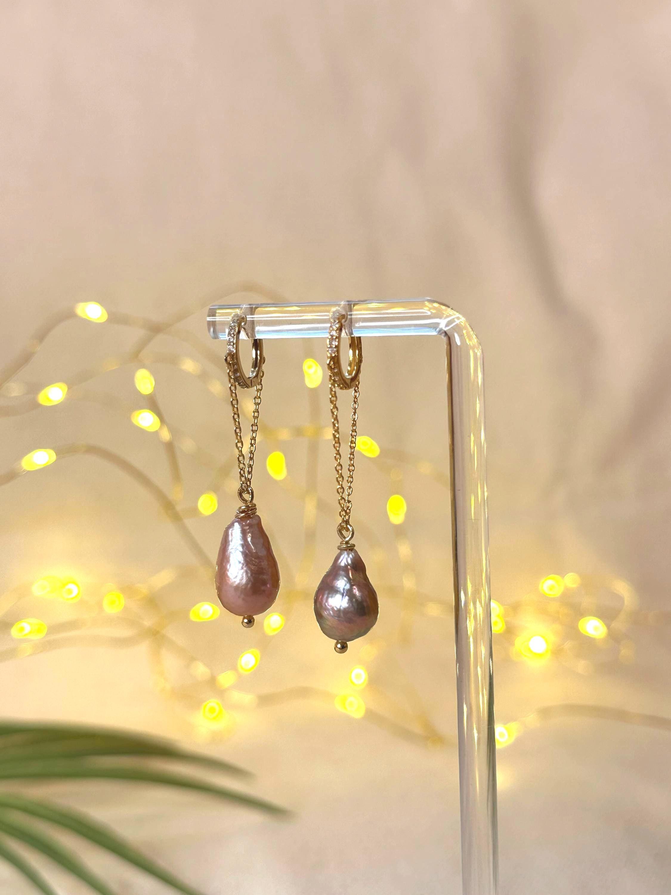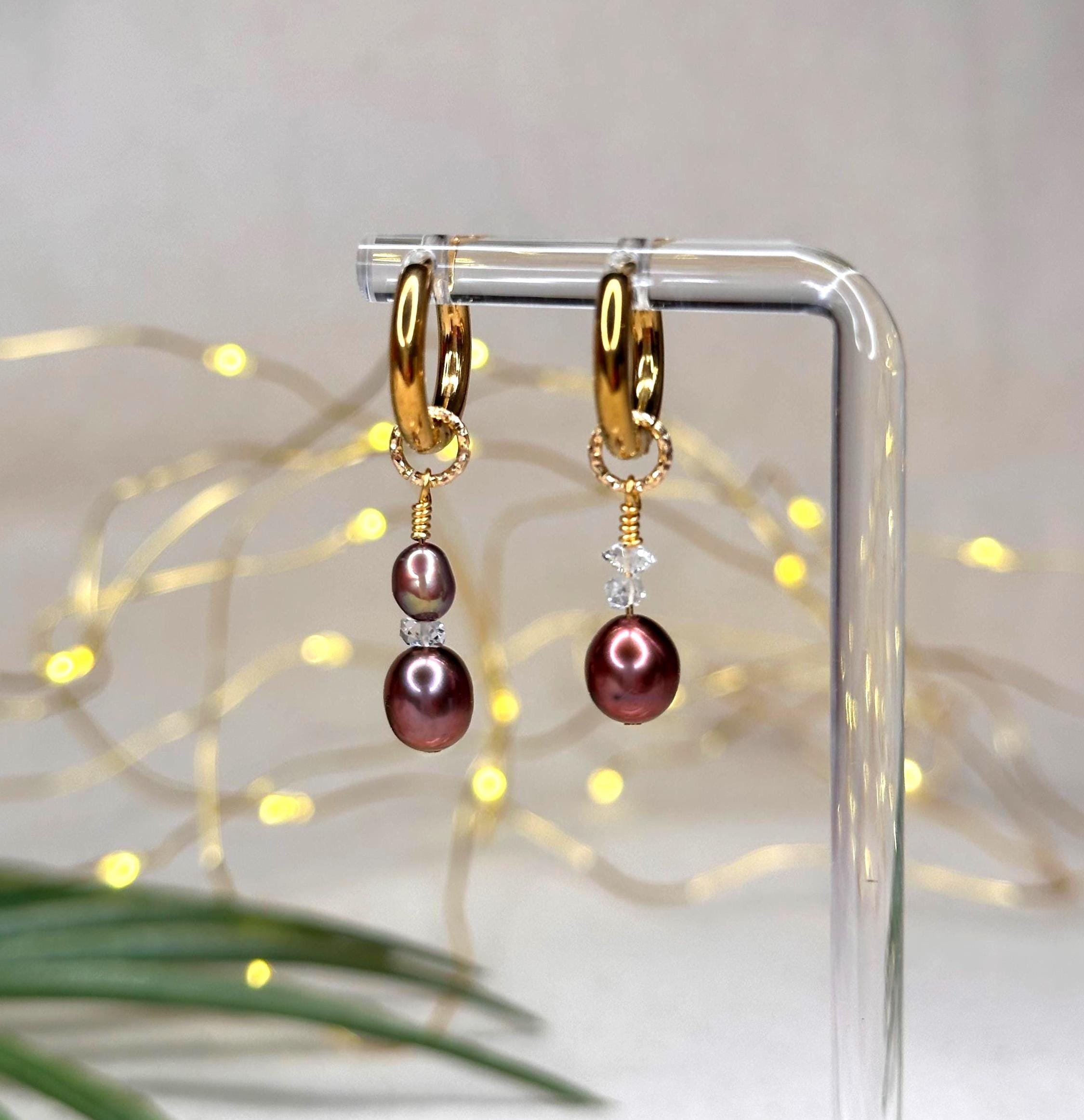 Dark Tahitian pearls sway from glowing gold hoops, paired with CZ charms—an alchemy of light and depth made to feel like an ocean-born spell you wear.