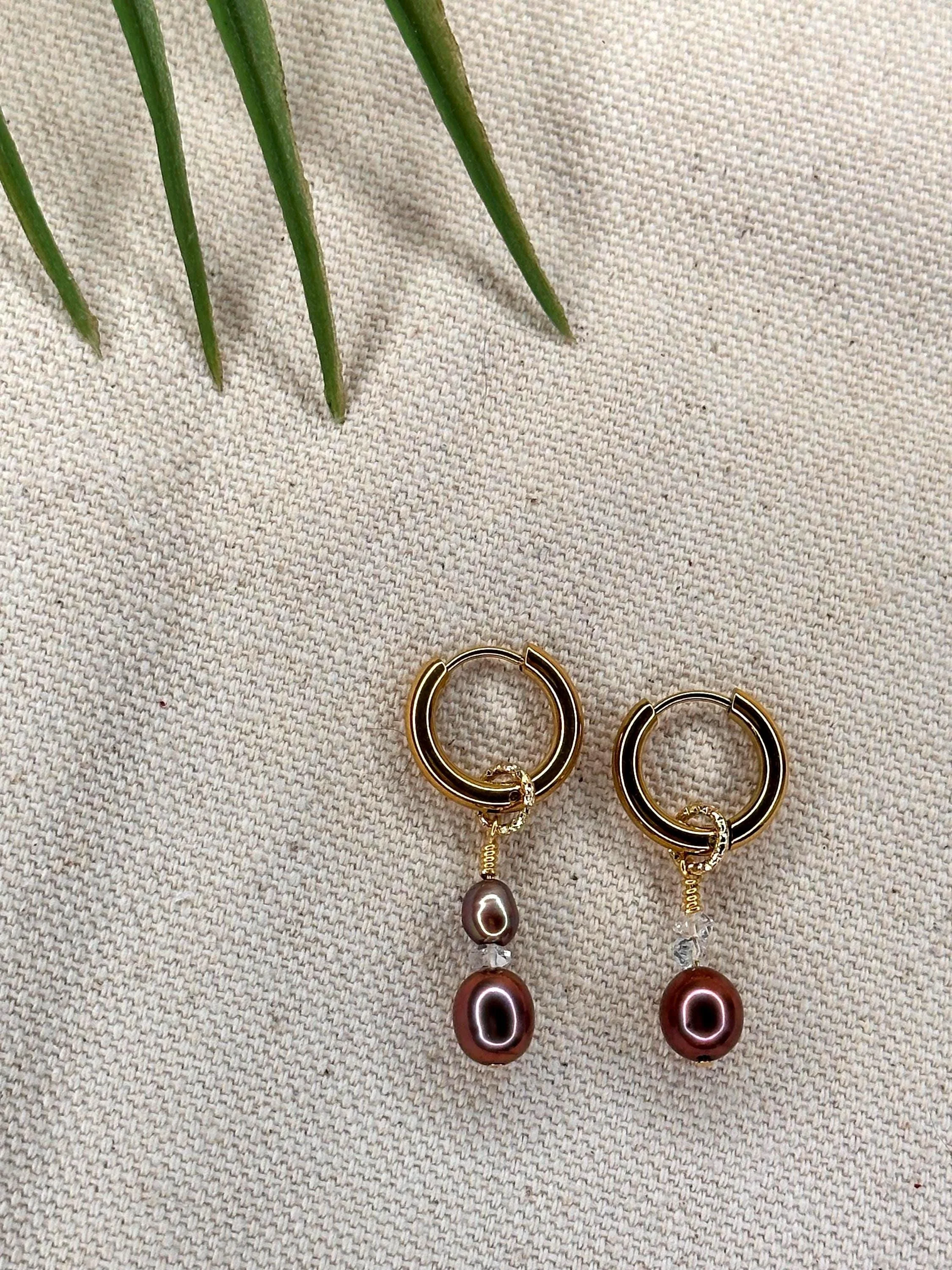 Stainless steel, 18k gold pvd plated hoops with Tahitian pearls, gold-filled CZ charms, and all gold-filled hardware. Charms detachable for customization.