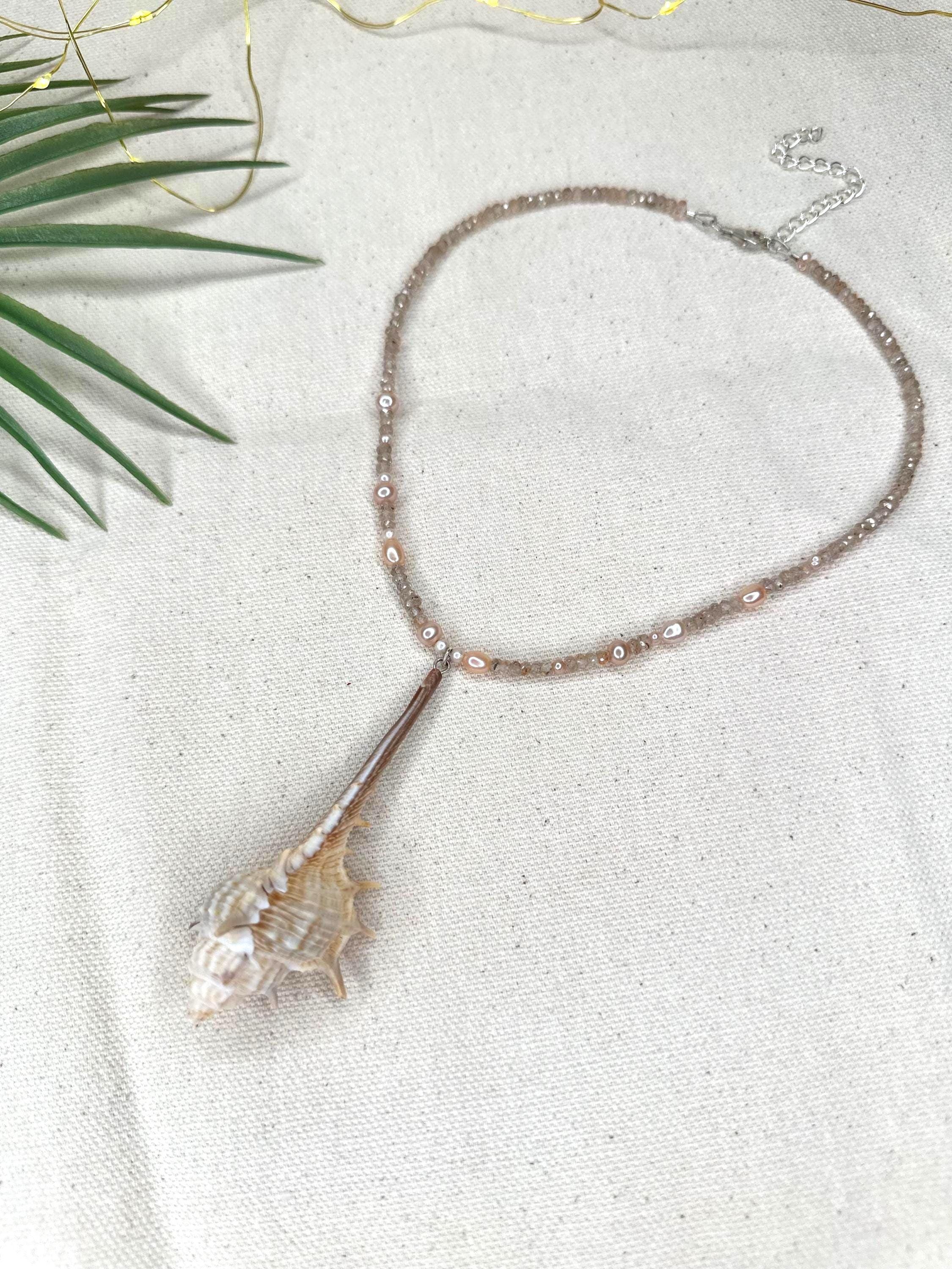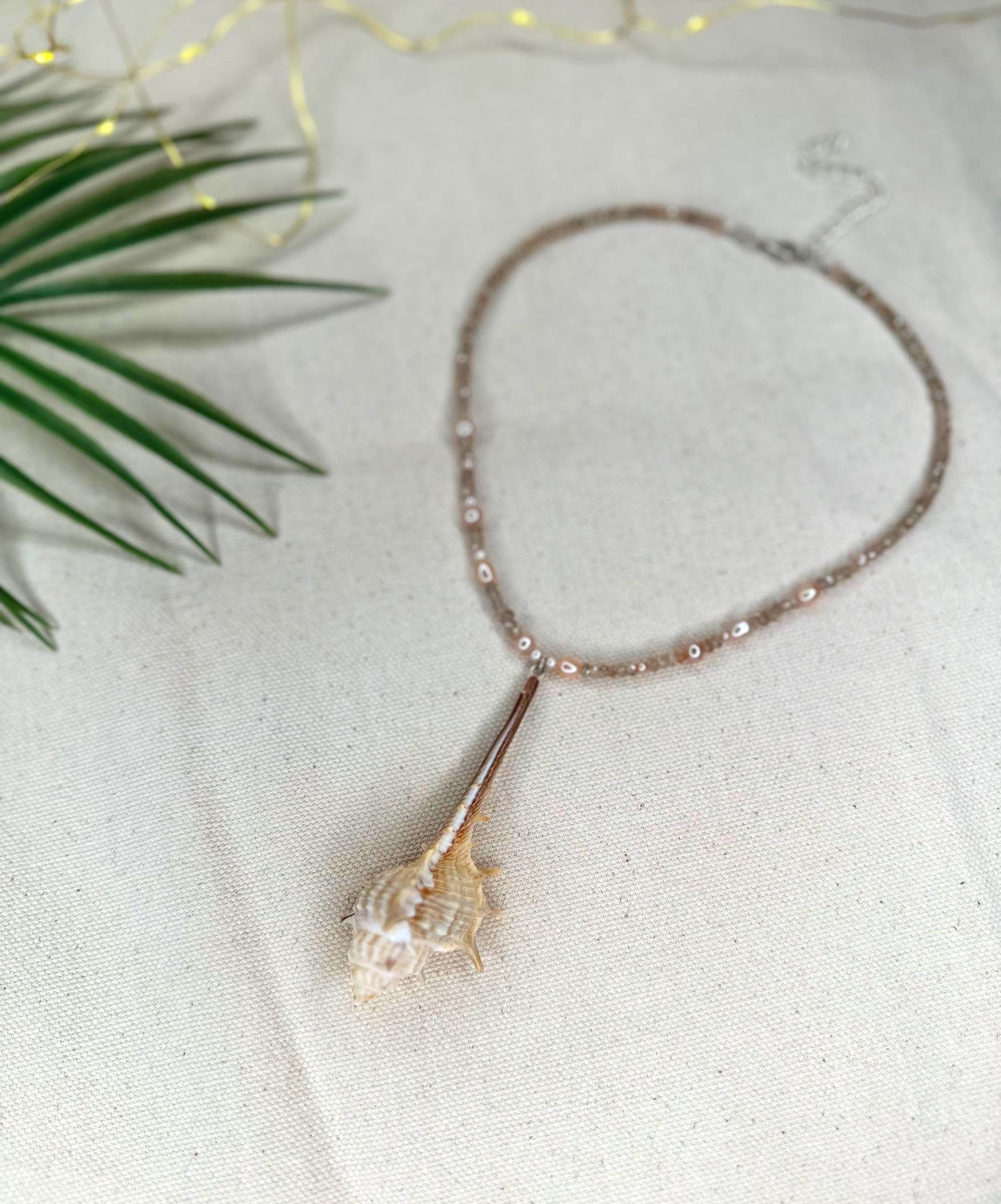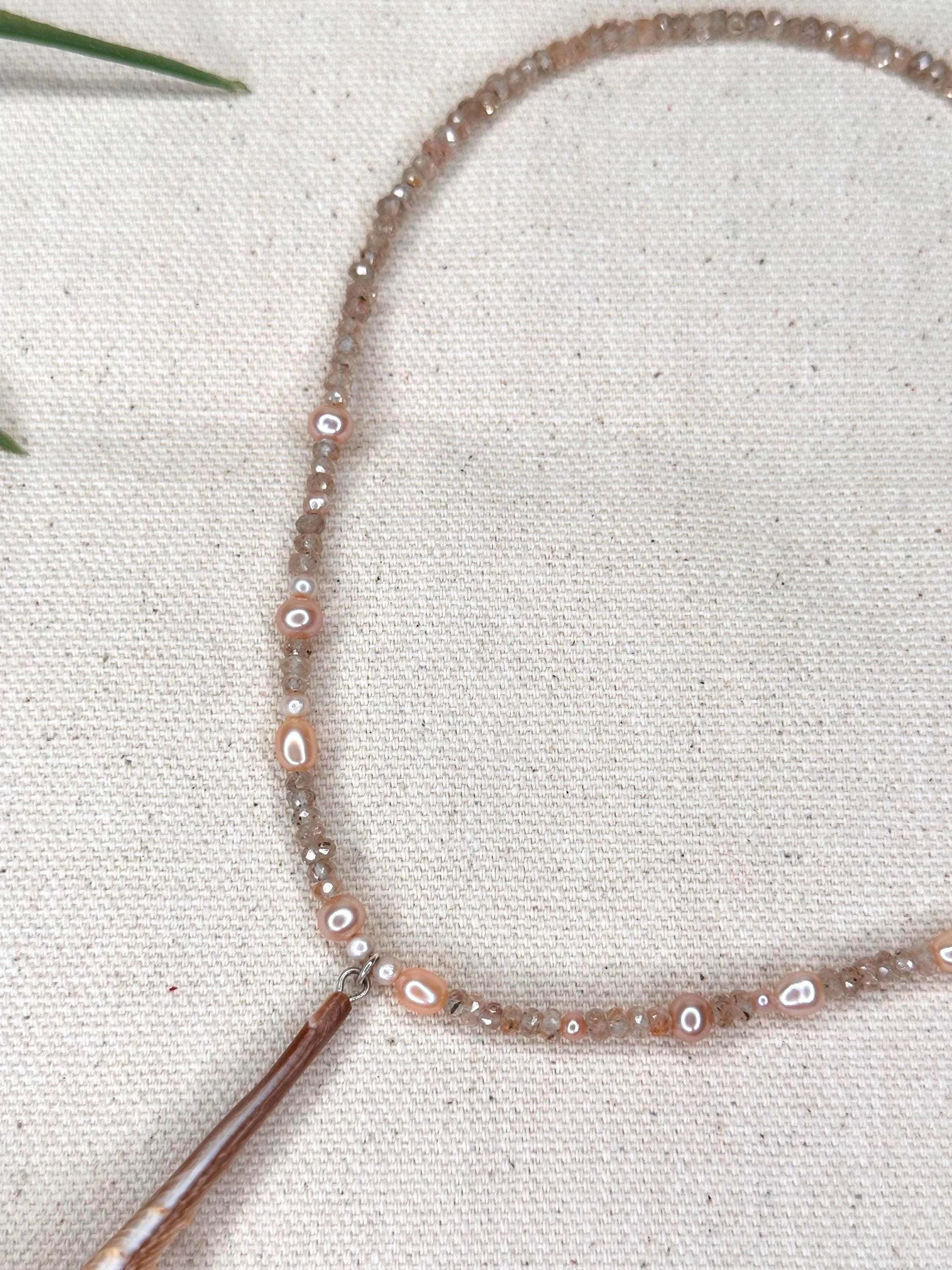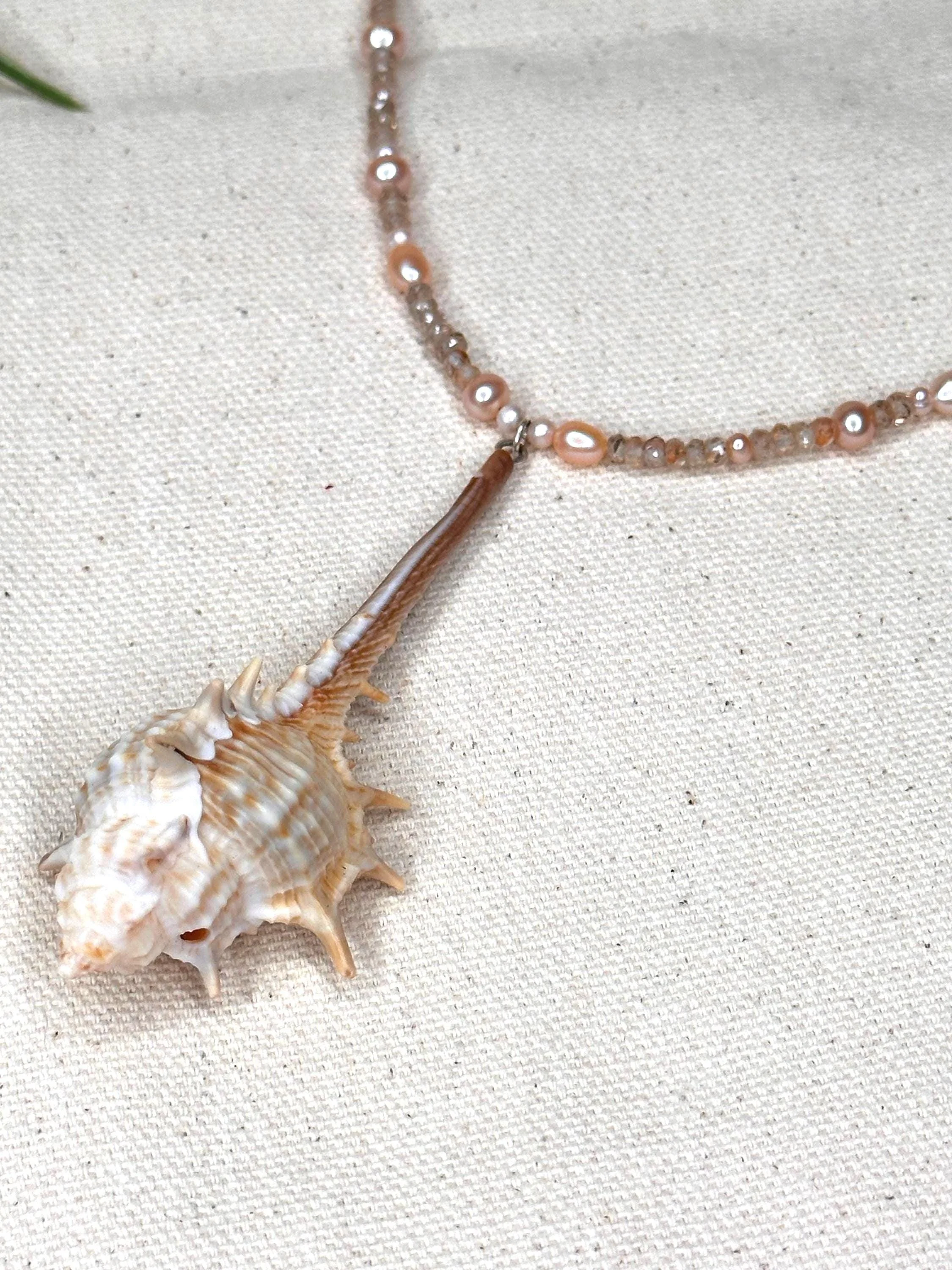 A 16" strand shaped by the colors and textures of a sunlit shoreline—hand-crafted pink resin coral sticks glowing like soft reef branches beneath clear water, micro-faceted sunstone flickering with warm tidal light, and pearls scattered like treasures left behind by the retreating sea. Three pink calico scallop shells gather at the center, each one a tiny ode to salt, sand, and the quiet magic of coastal worlds. Finished with sterling silver hardware and a 1" extender, this necklace feels like wearing a piece of the tide’s own poetry.