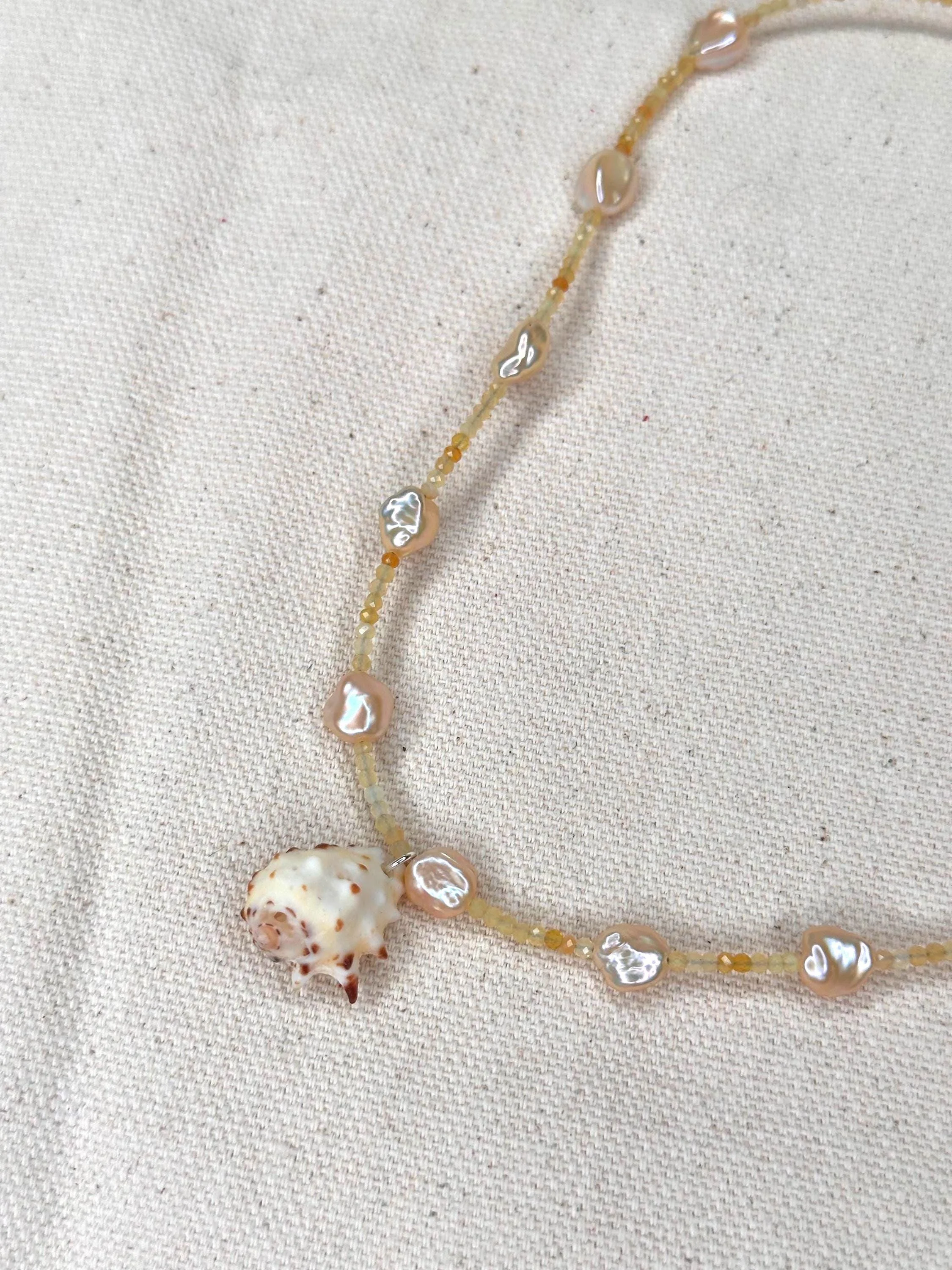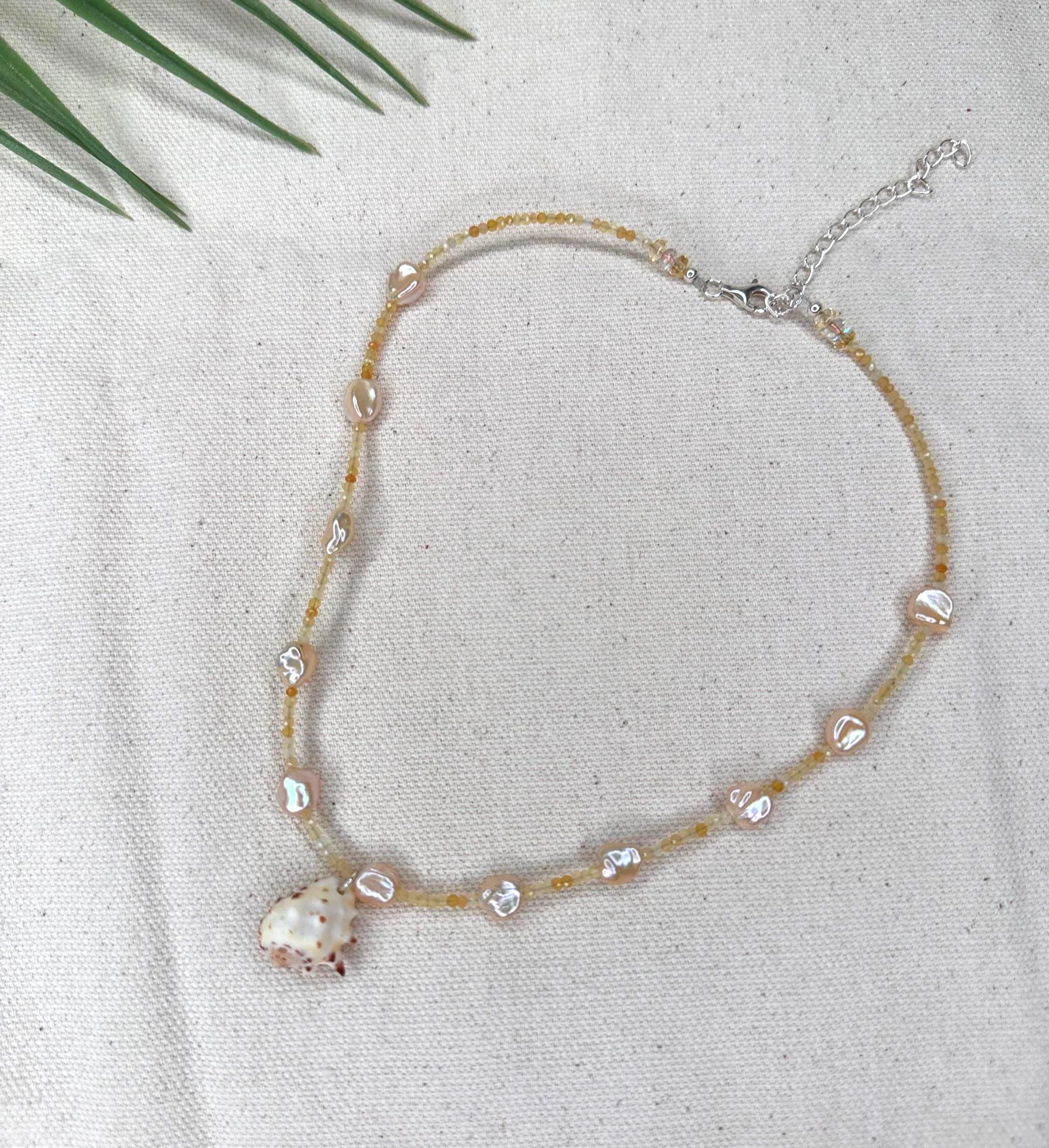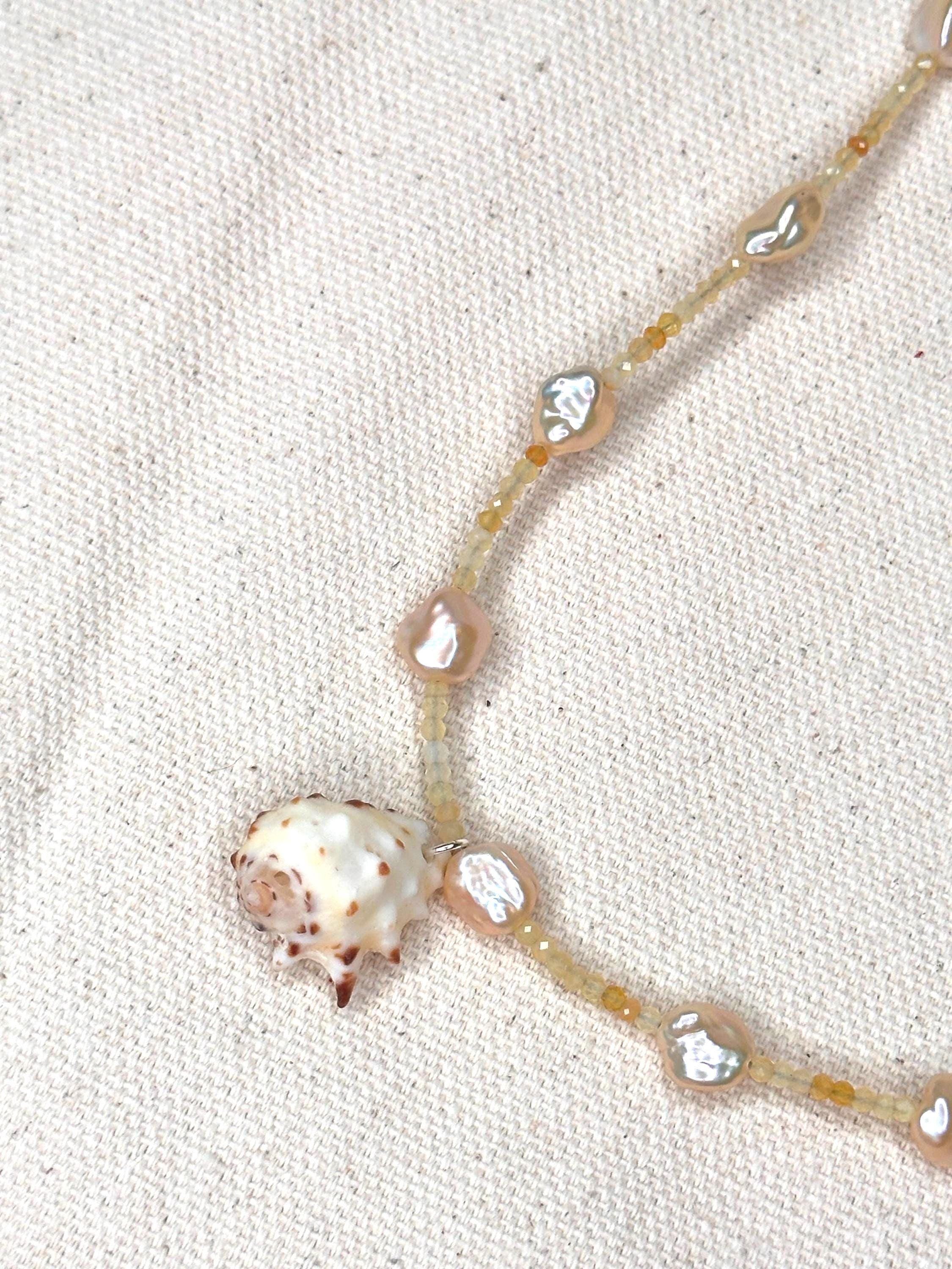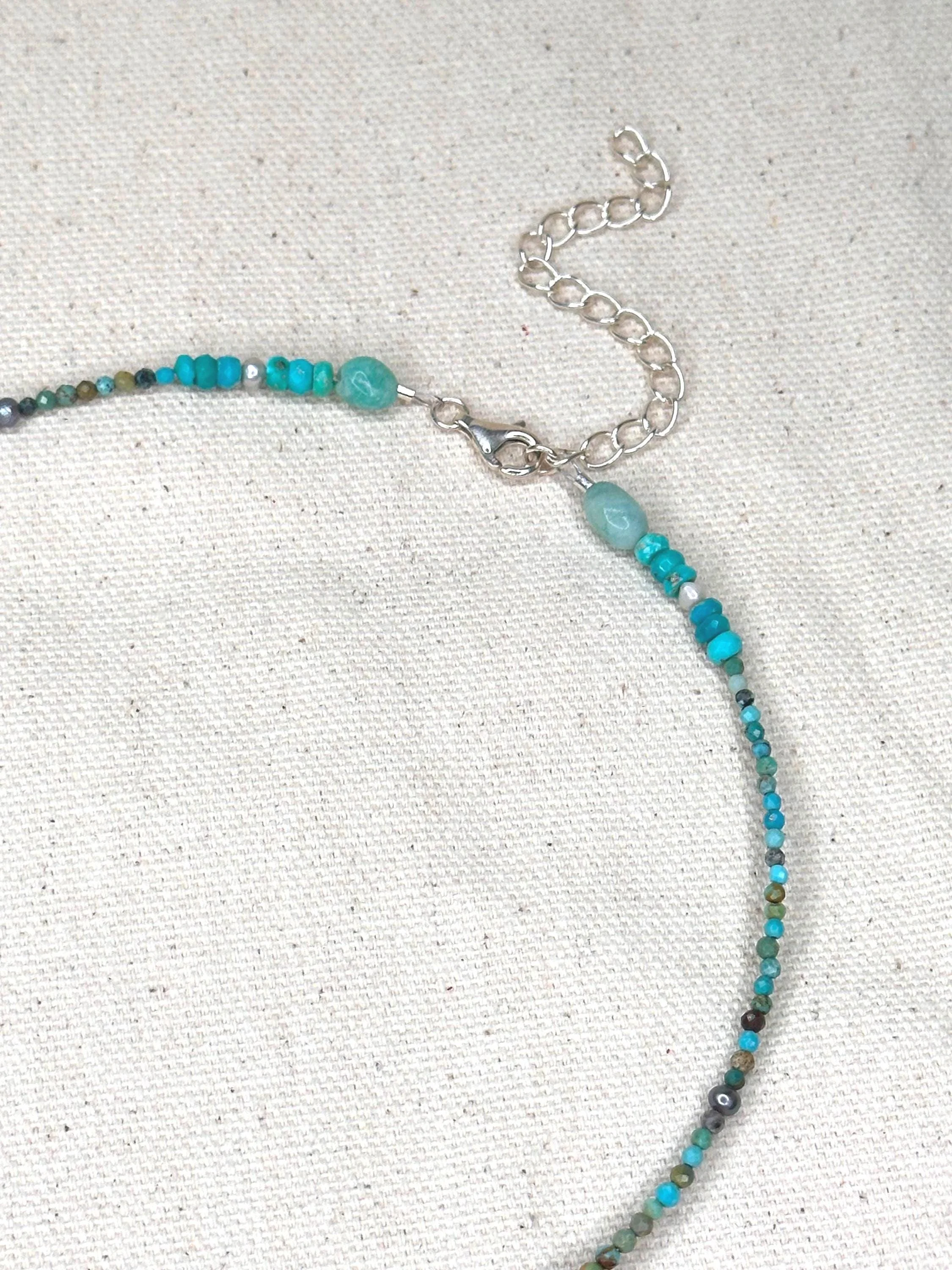 A 15" choker strung with mixed turquoise stones that echo sunlit shallows, softened by luminous blue/silver pearls and the gentle sea-glass tones of amazonite. Three coffee bean Trivia shells sit at the center like tiny treasures gathered along a warm tide line—each one a quiet fragment of ocean memory. Finished with sterling silver hardware and a 1.5" extender, this choker feels fresh, earthy, and timeless—an effortless talisman of coastal wanderings and salt-kissed serenity.