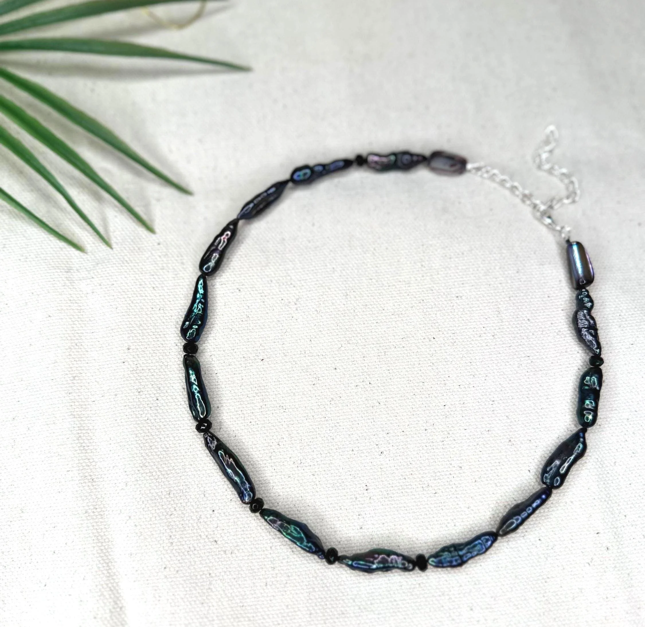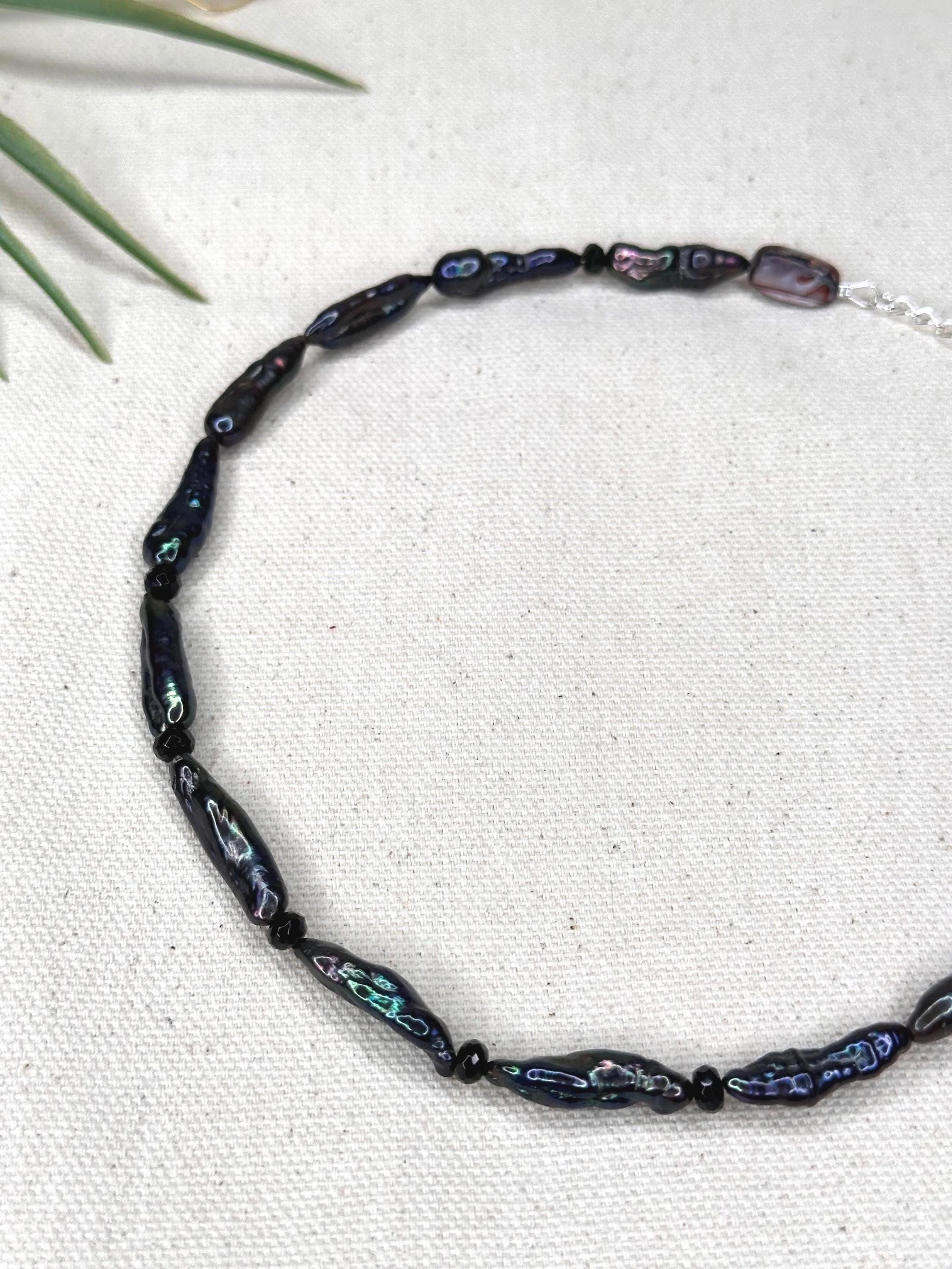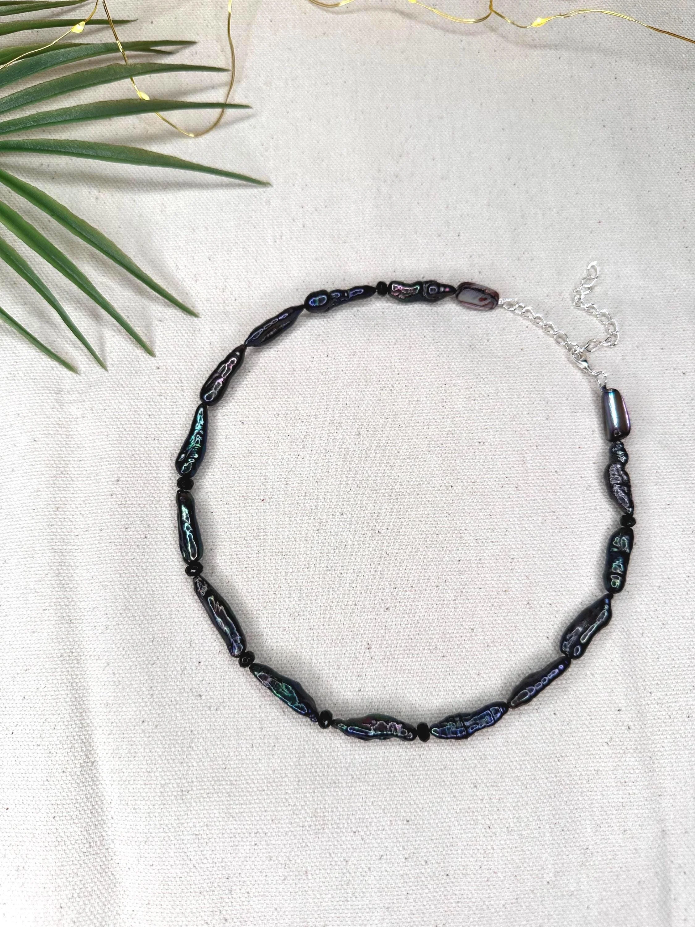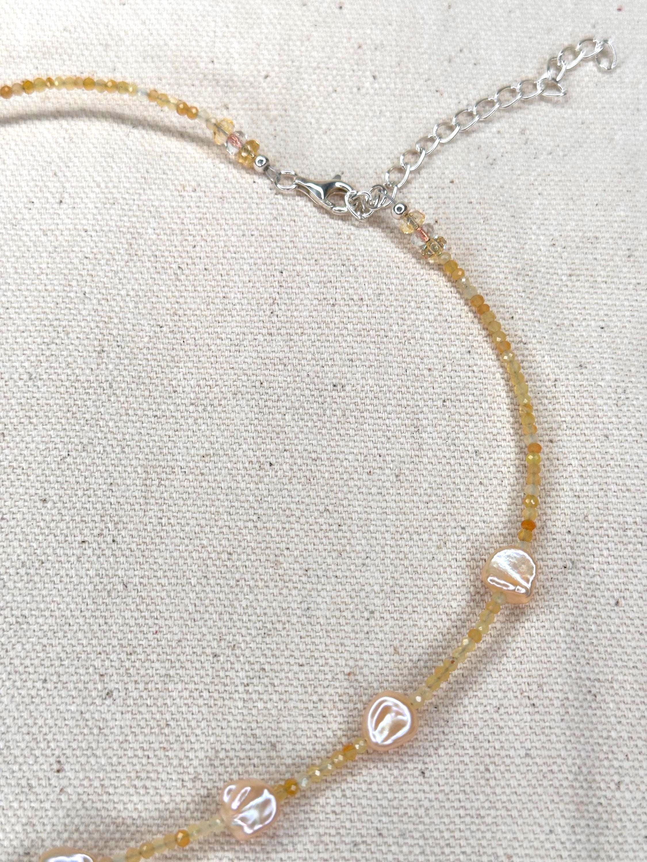 A 15" choker strung with mixed turquoise stones that echo sunlit shallows, softened by luminous blue/silver pearls and the gentle sea-glass tones of amazonite. Three coffee bean Trivia shells sit at the center like tiny treasures gathered along a warm tide line—each one a quiet fragment of ocean memory. Finished with sterling silver hardware and a 1.5" extender, this choker feels fresh, earthy, and timeless—an effortless talisman of coastal wanderings and salt-kissed serenity.