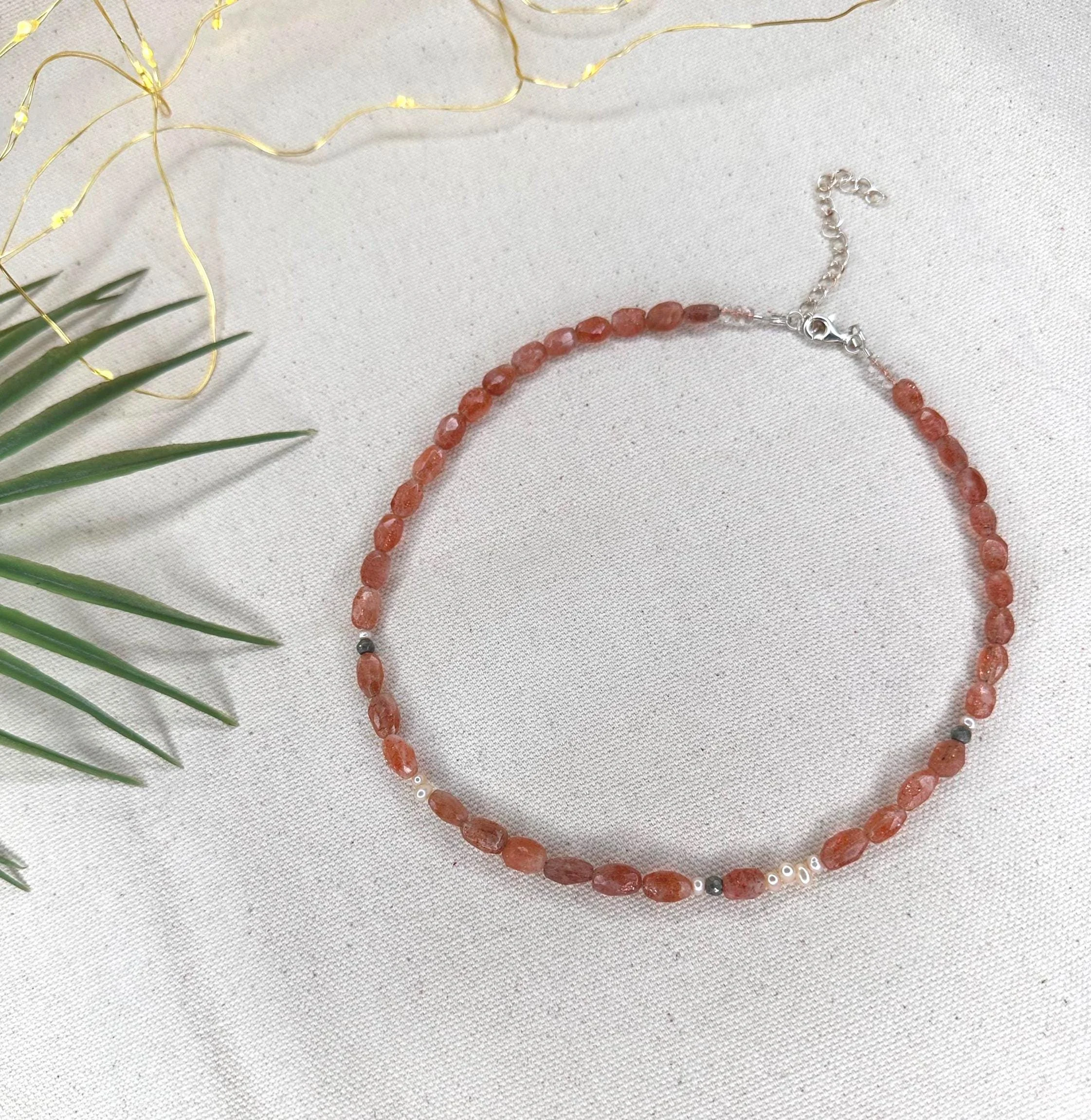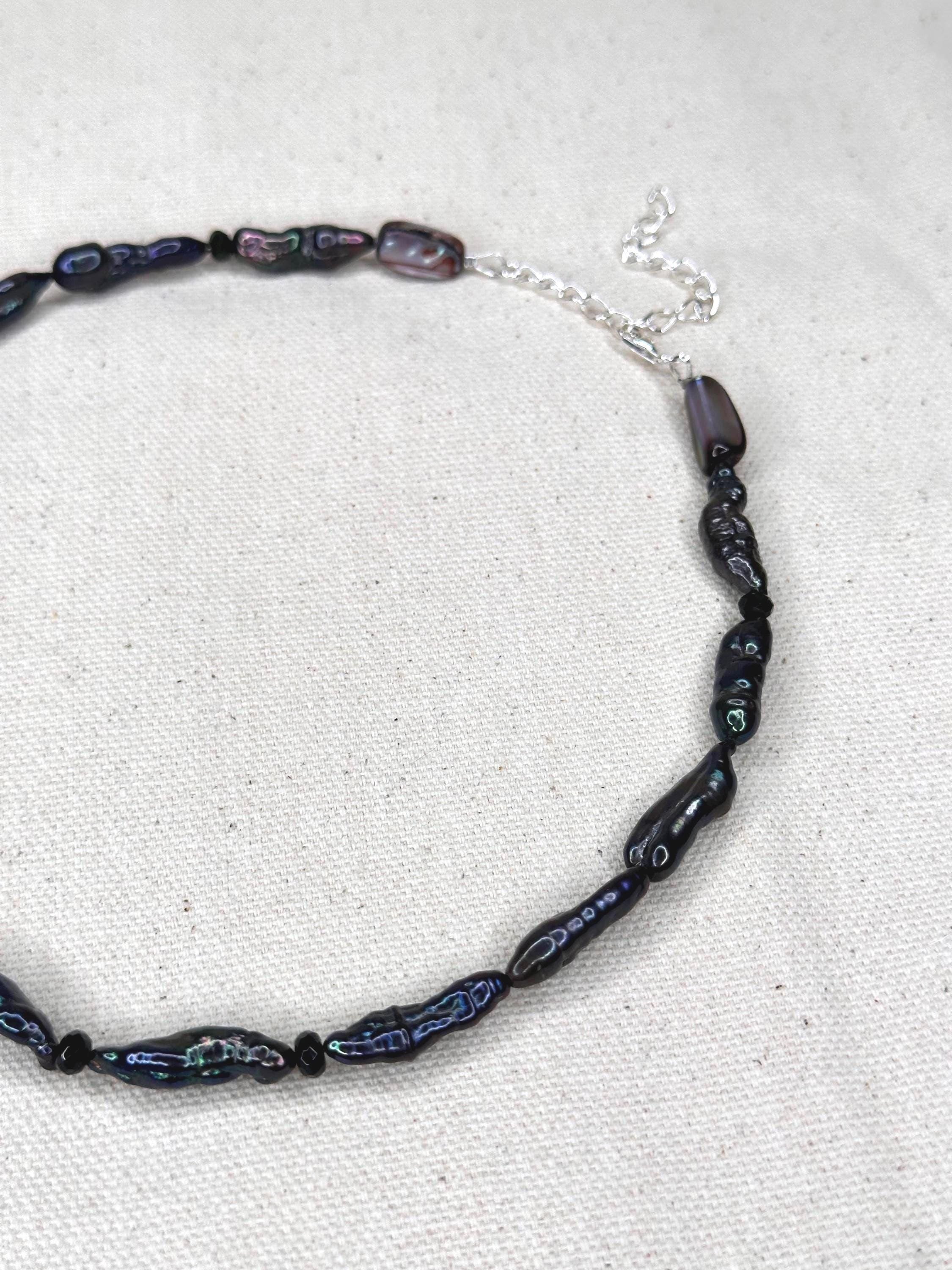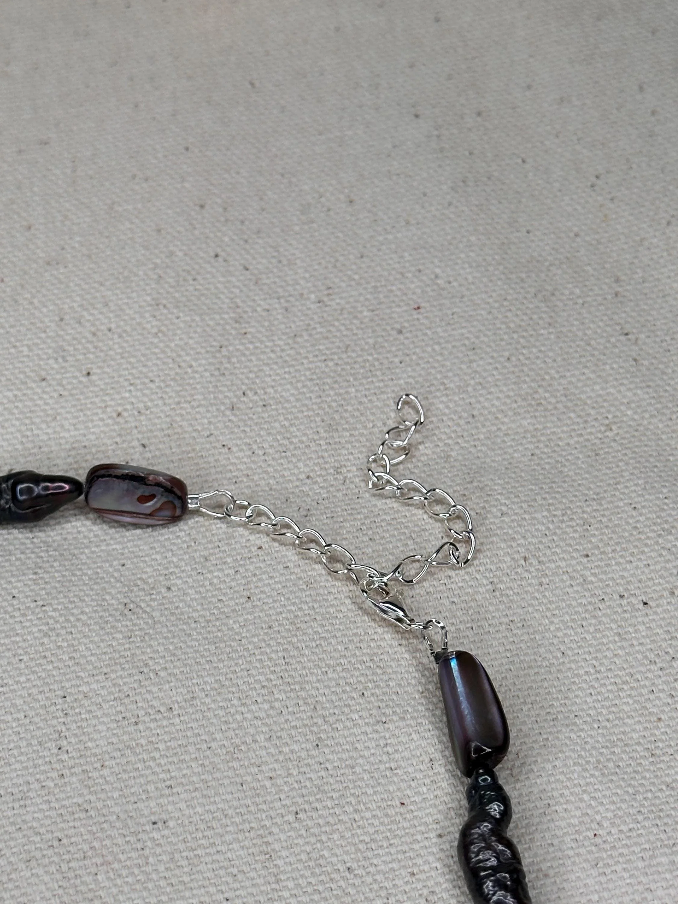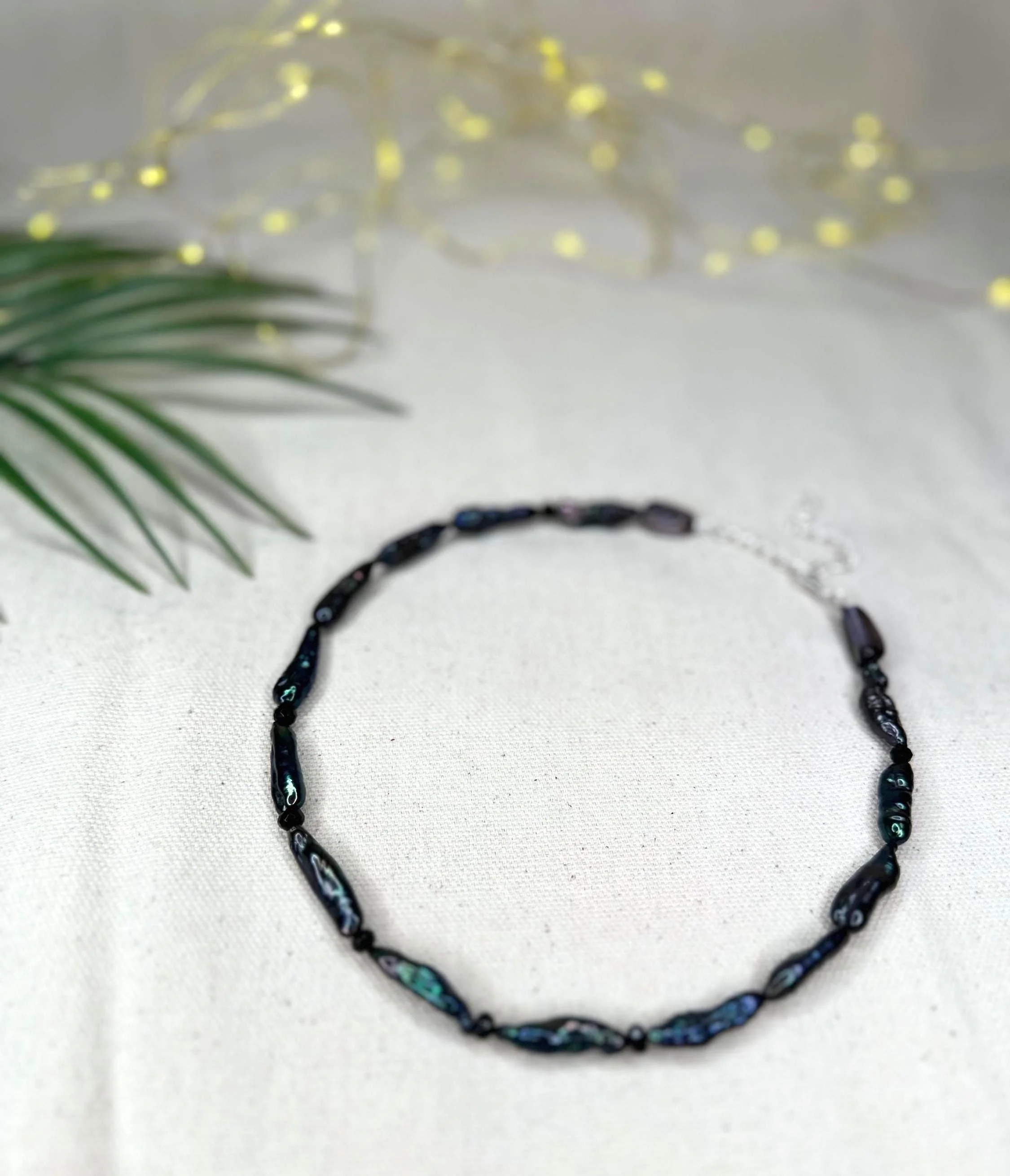 A 15" choker strung with mixed turquoise stones that echo sunlit shallows, softened by luminous blue/silver pearls and the gentle sea-glass tones of amazonite. Three coffee bean Trivia shells sit at the center like tiny treasures gathered along a warm tide line—each one a quiet fragment of ocean memory. Finished with sterling silver hardware and a 1.5" extender, this choker feels fresh, earthy, and timeless—an effortless talisman of coastal wanderings and salt-kissed serenity.