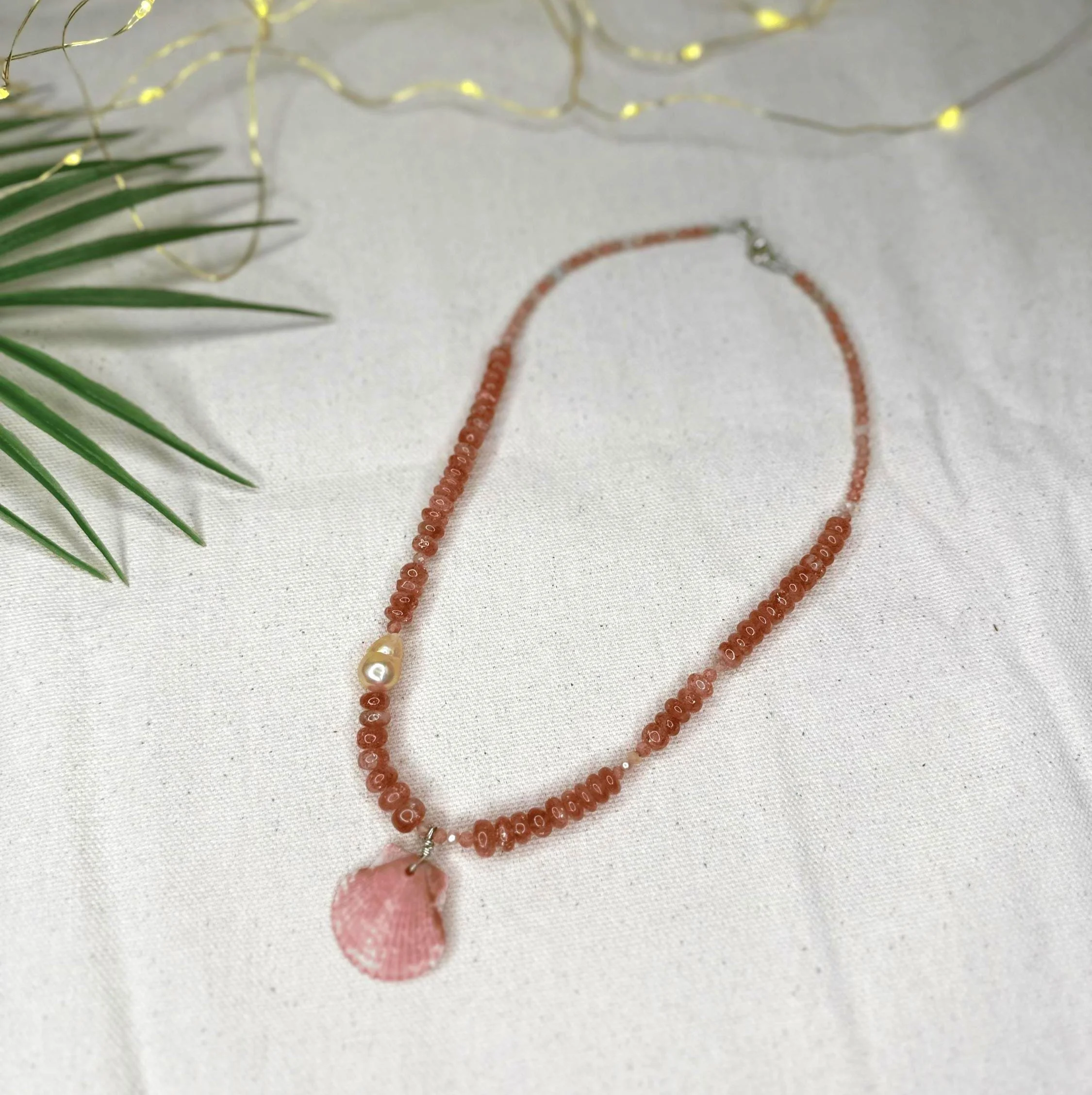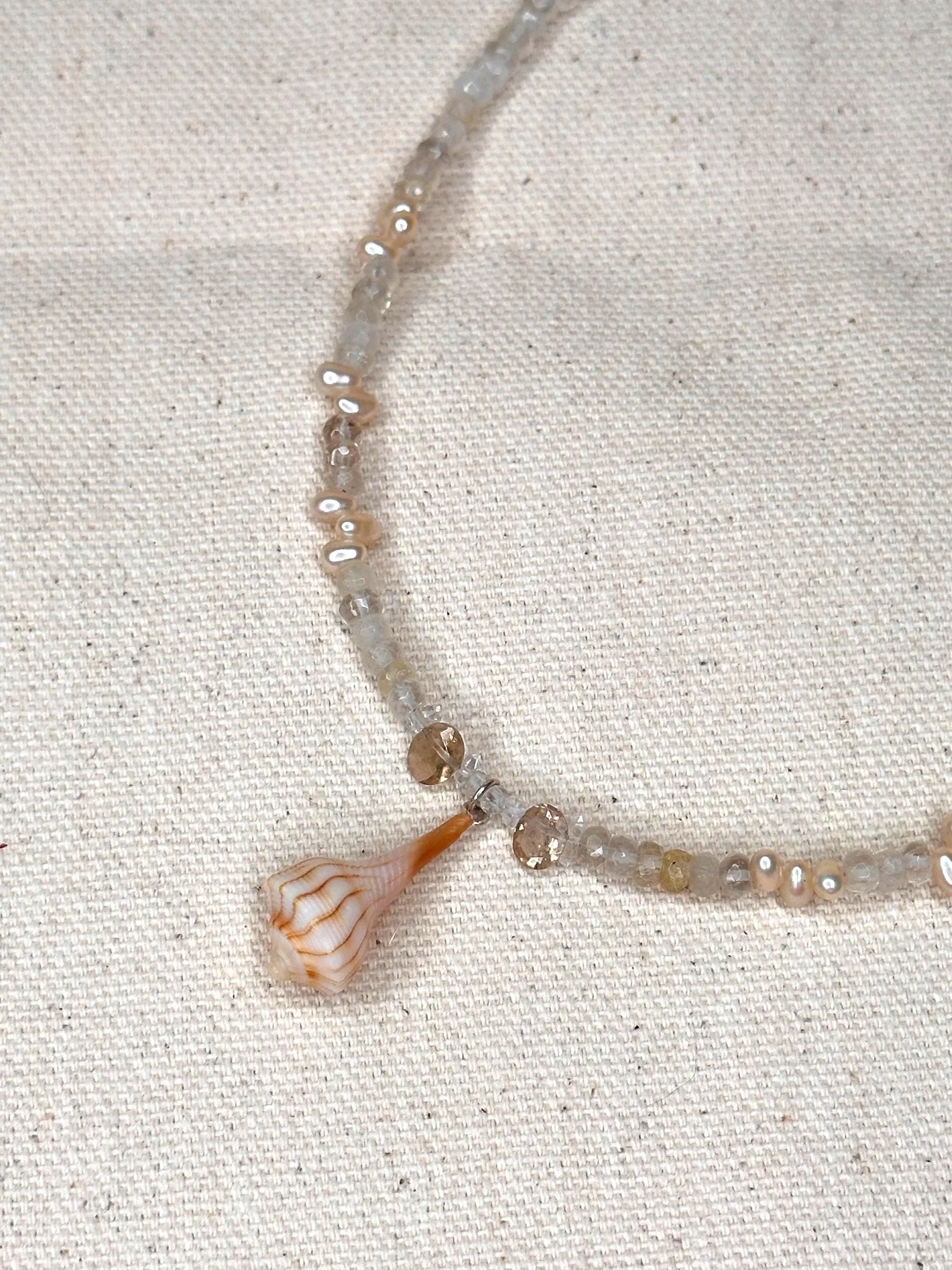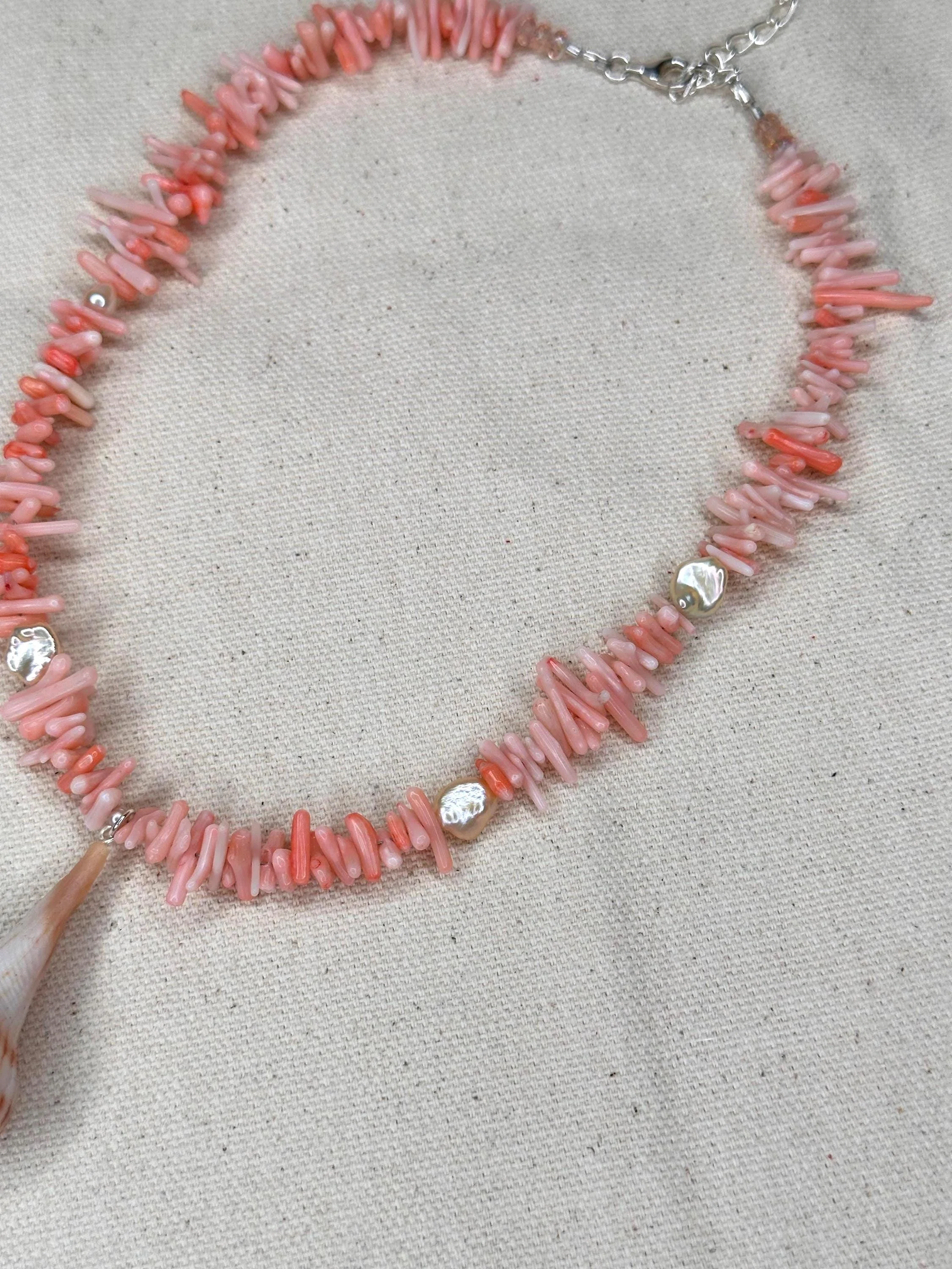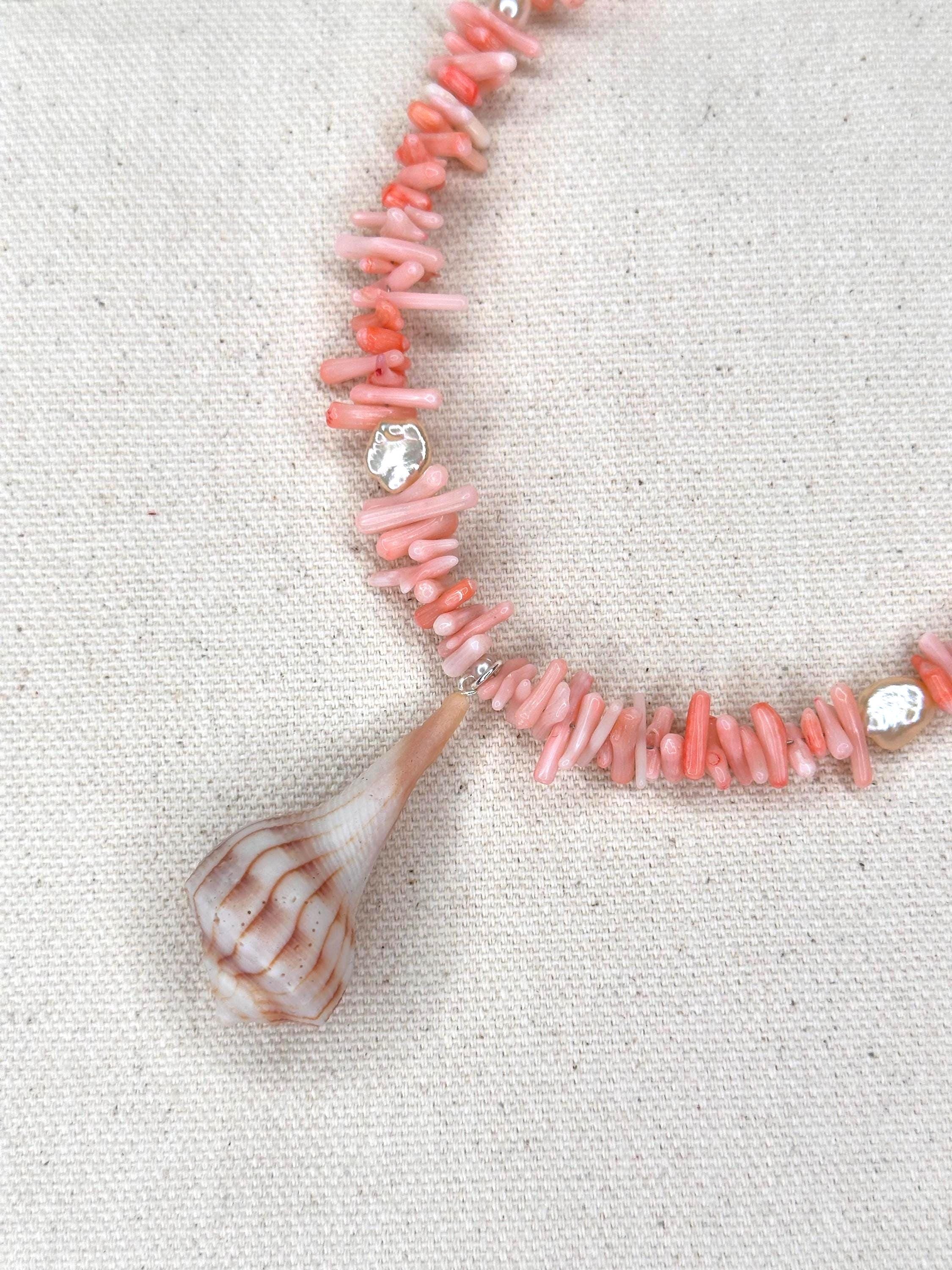 Soft as sea foam and sculpted with care, this necklace features hand-carved resin beads designed to echo the delicate blush of angel skin coral — a timeless ocean hue without the impact. Champagne-toned freshwater keishi pearls add an organic shimmer, while a light-colored lightning whelk shell, collected from the shores of Southwest Florida, brings coastal soul to the piece.