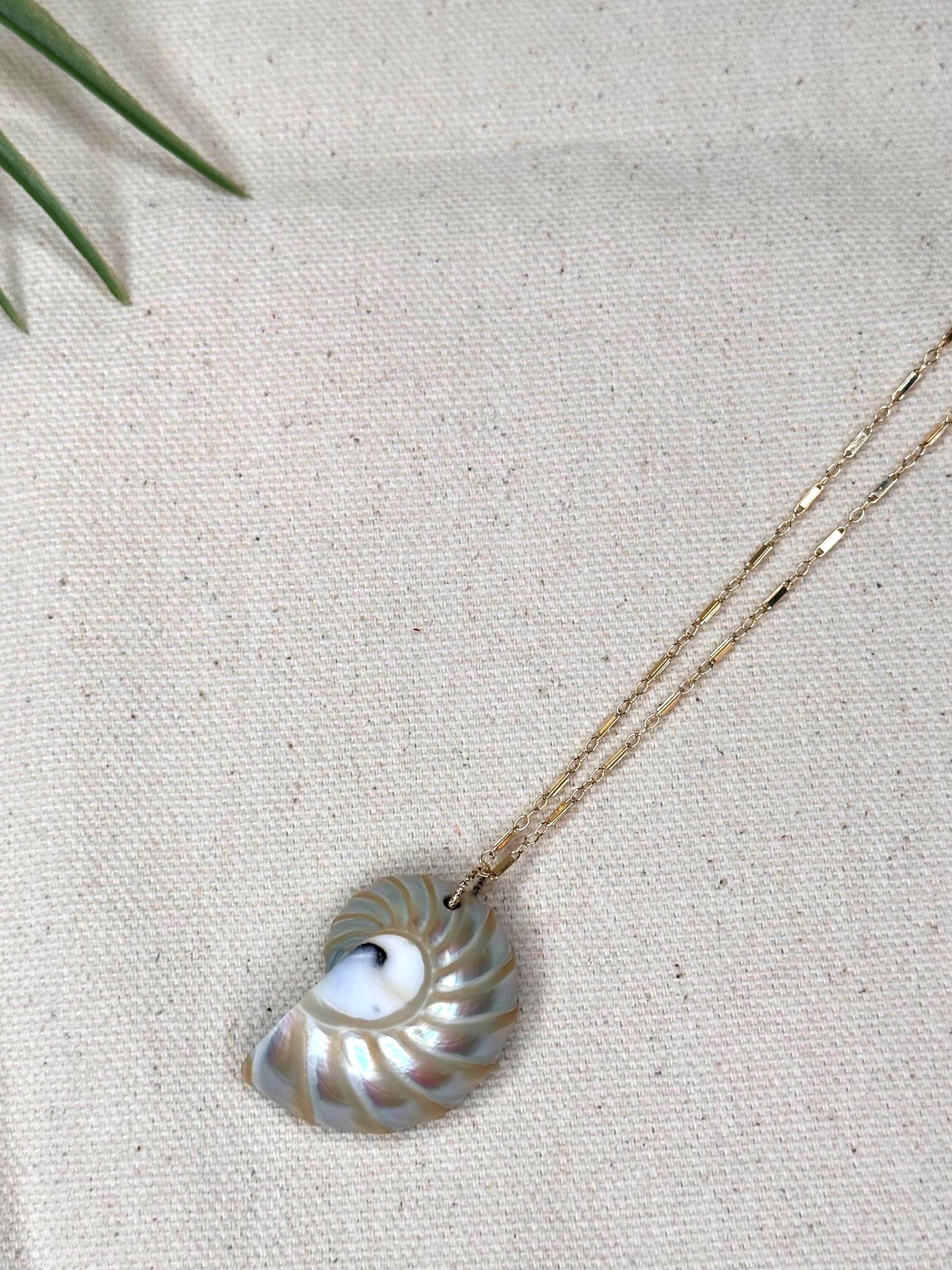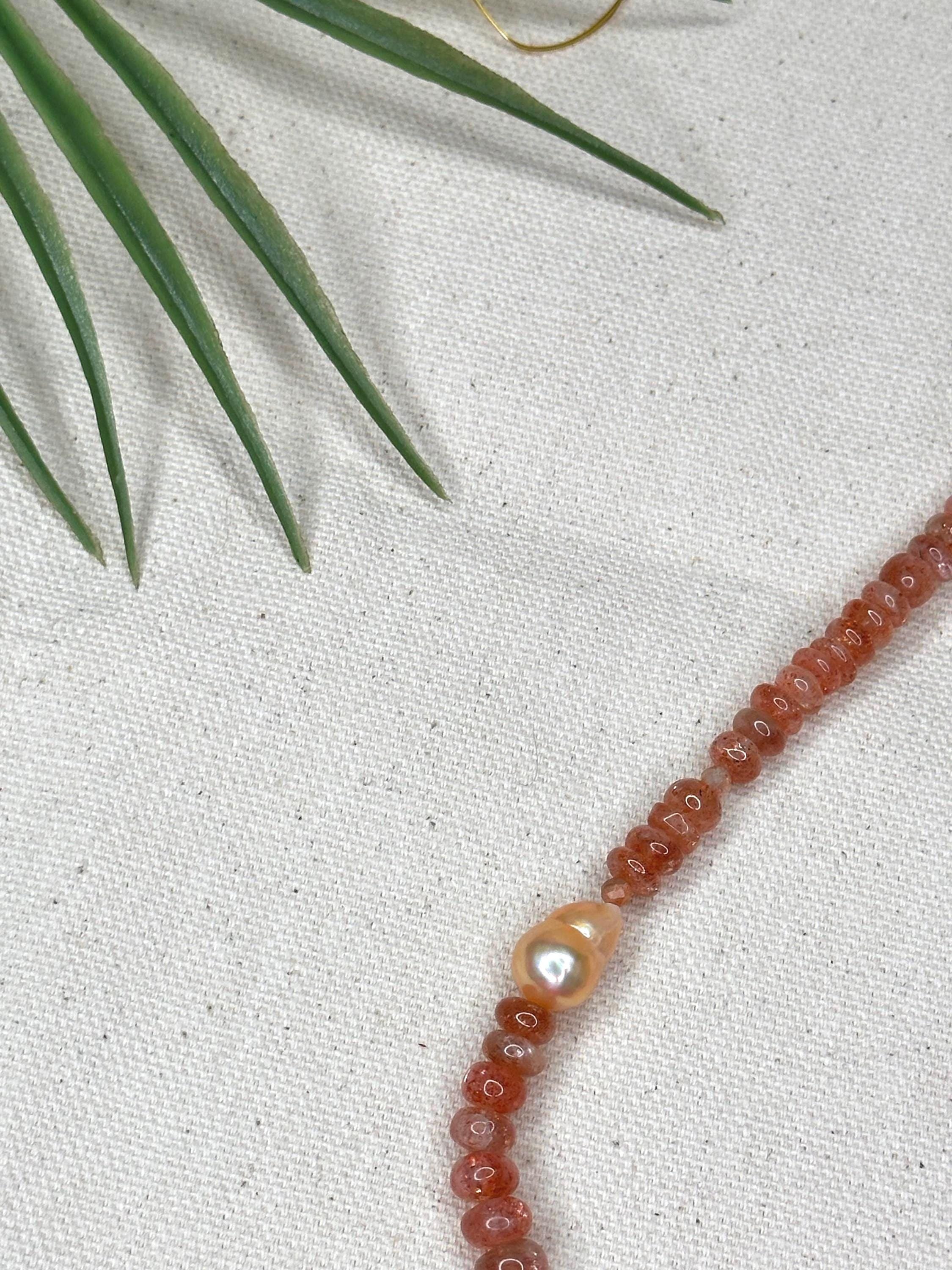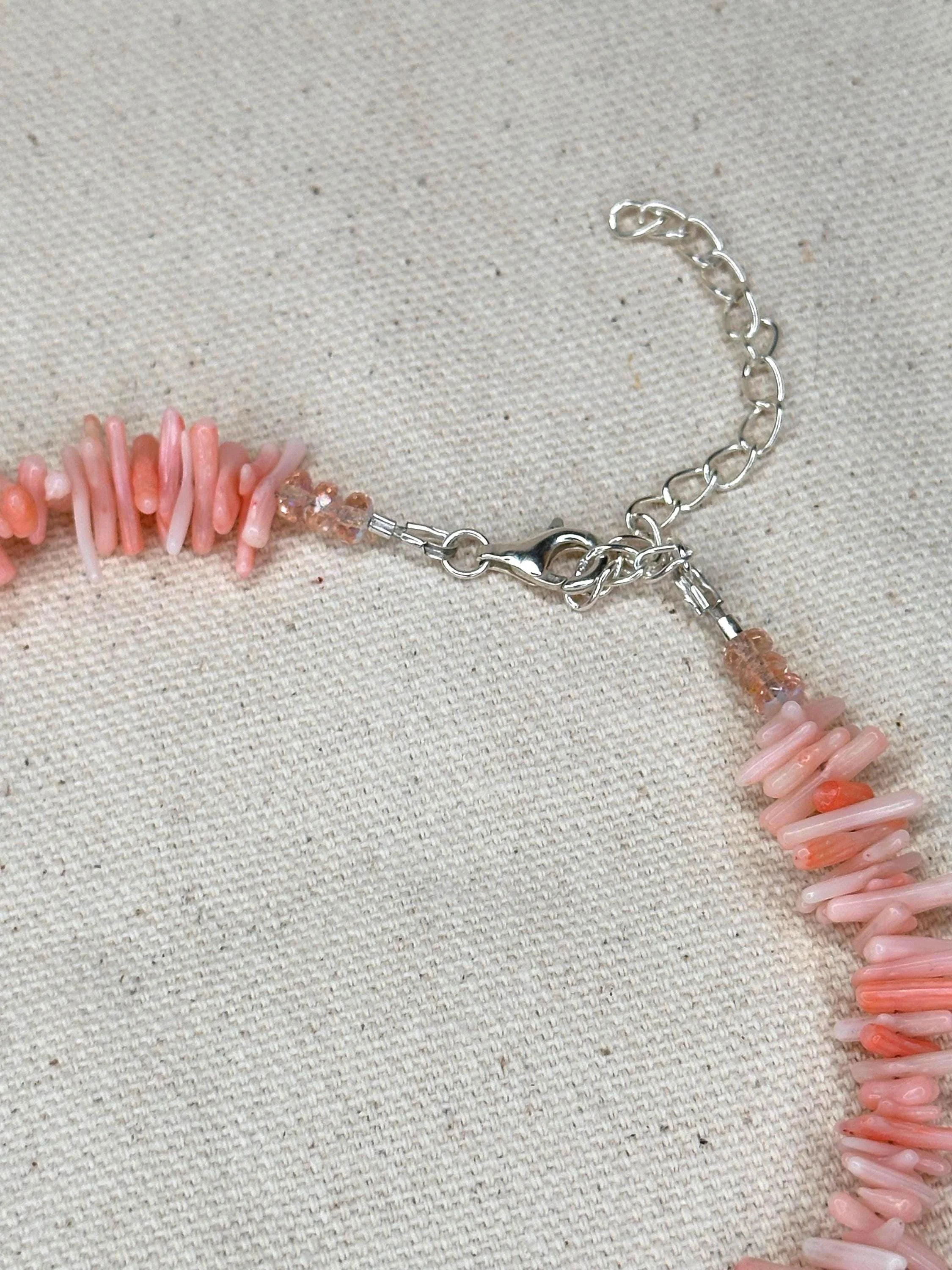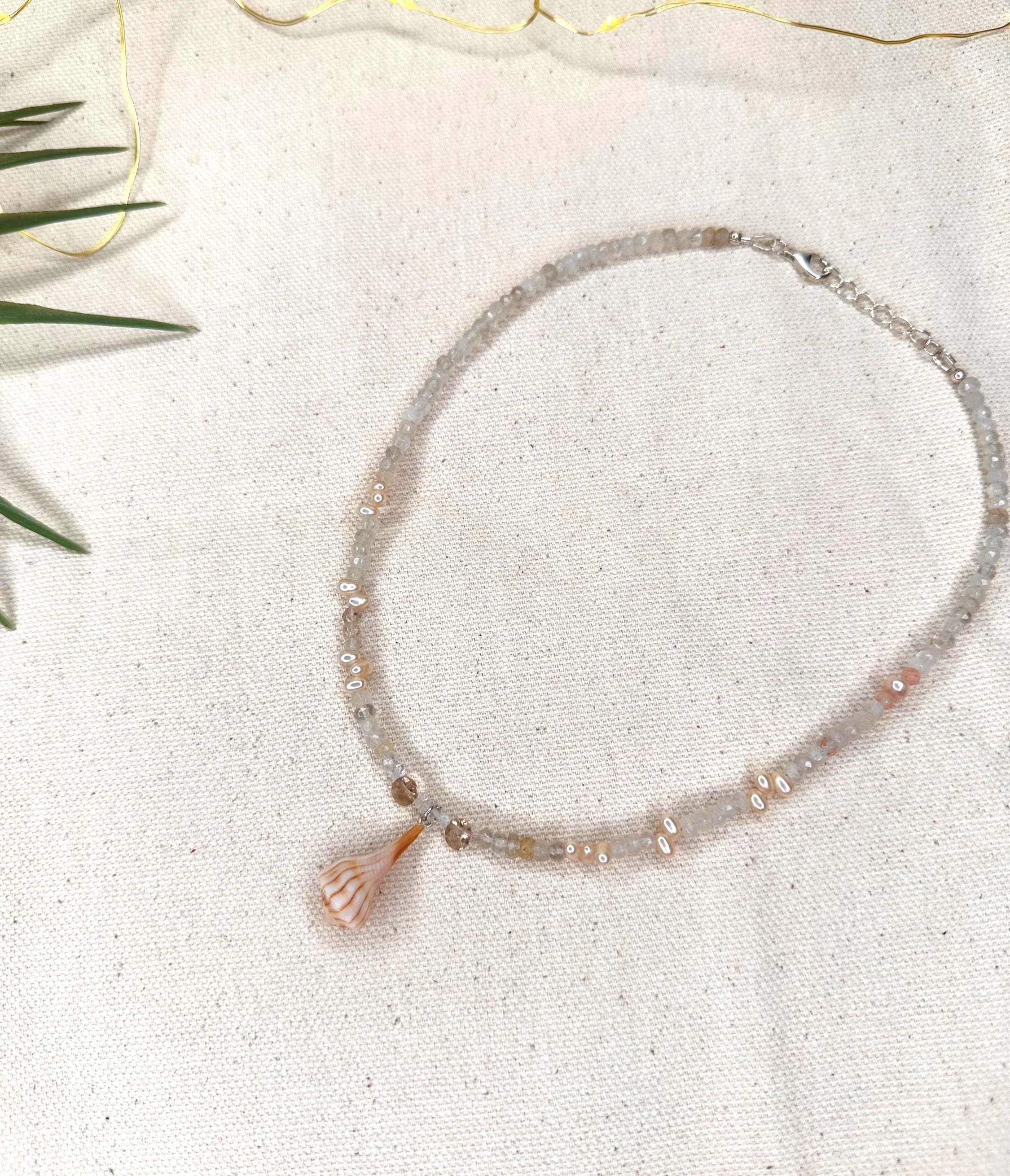 Soft as sea foam and sculpted with care, this necklace features hand-carved resin beads designed to echo the delicate blush of angel skin coral — a timeless ocean hue without the impact. Champagne-toned freshwater keishi pearls add an organic shimmer, while a light-colored lightning whelk shell, collected from the shores of Southwest Florida, brings coastal soul to the piece.