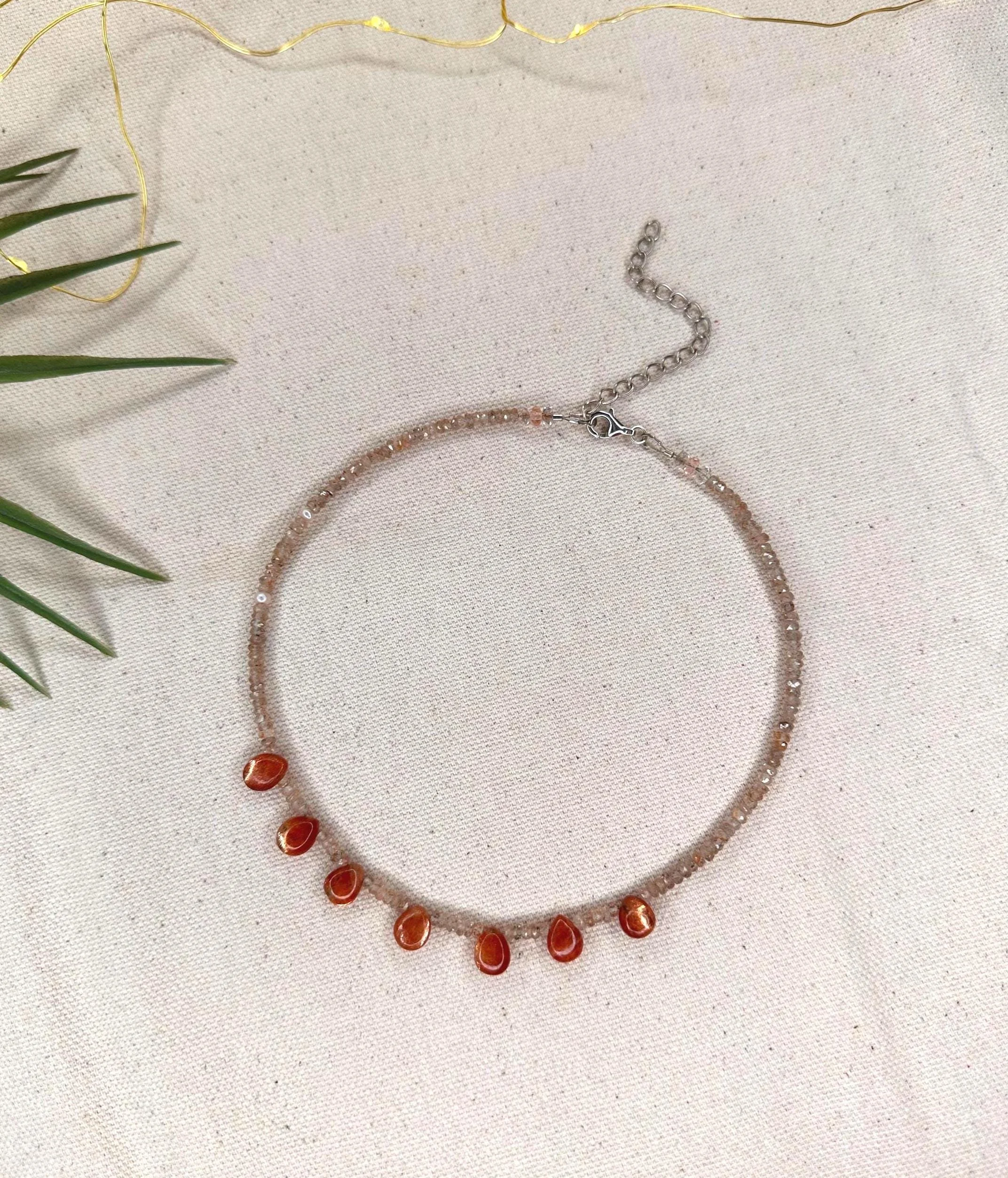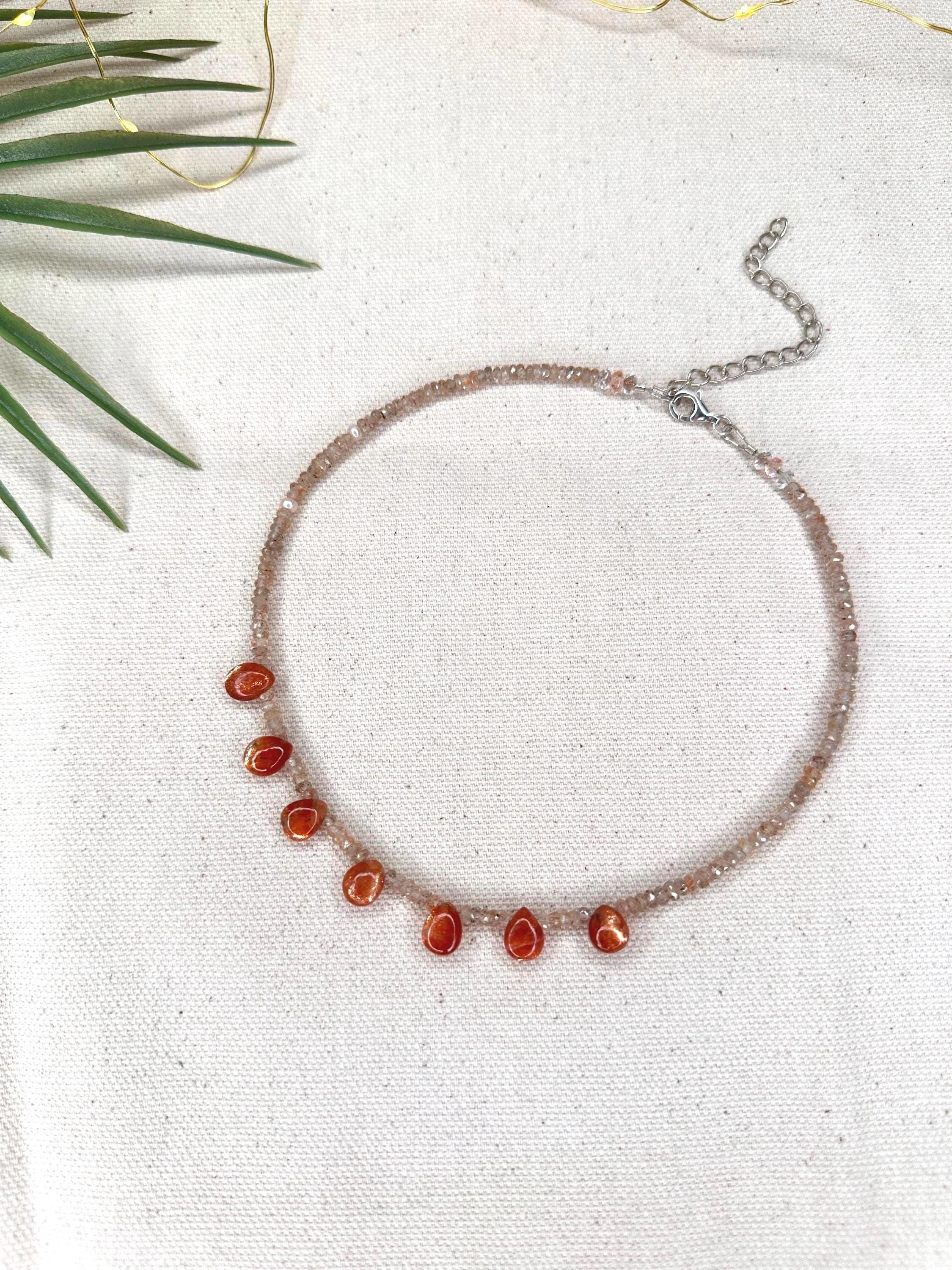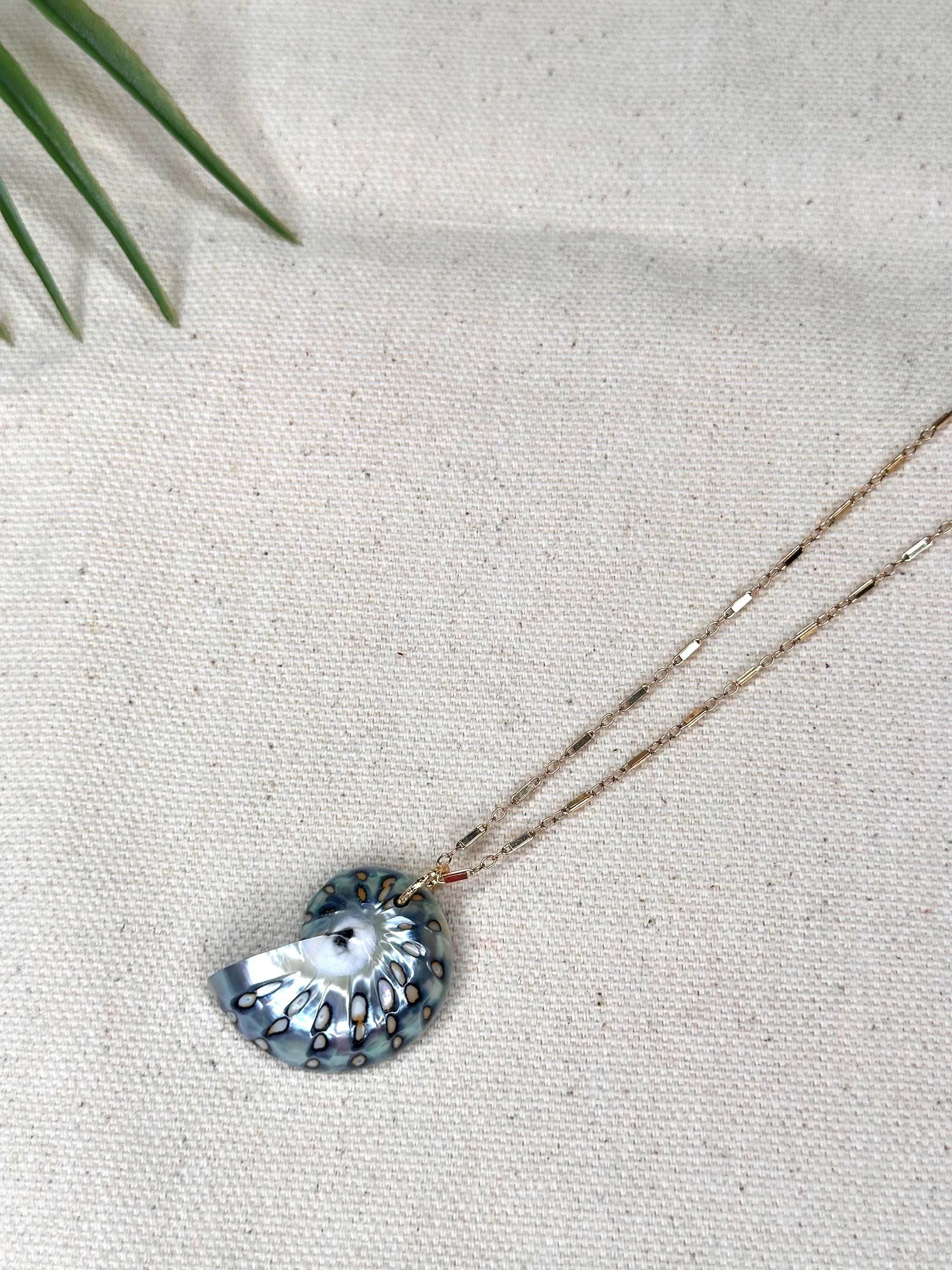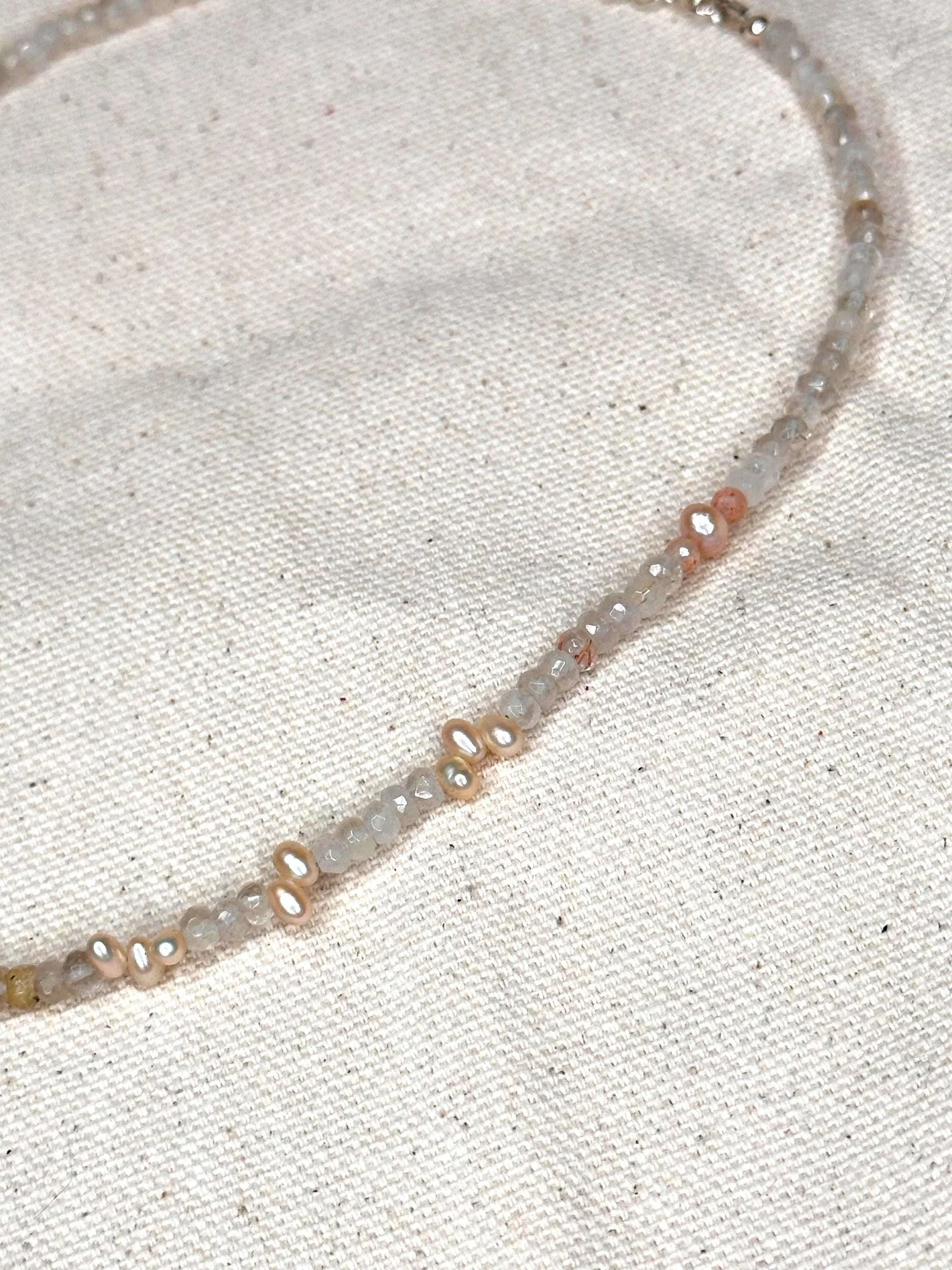 Soft as sea foam and sculpted with care, this necklace features hand-carved resin beads designed to echo the delicate blush of angel skin coral — a timeless ocean hue without the impact. Champagne-toned freshwater keishi pearls add an organic shimmer, while a light-colored lightning whelk shell, collected from the shores of Southwest Florida, brings coastal soul to the piece.
